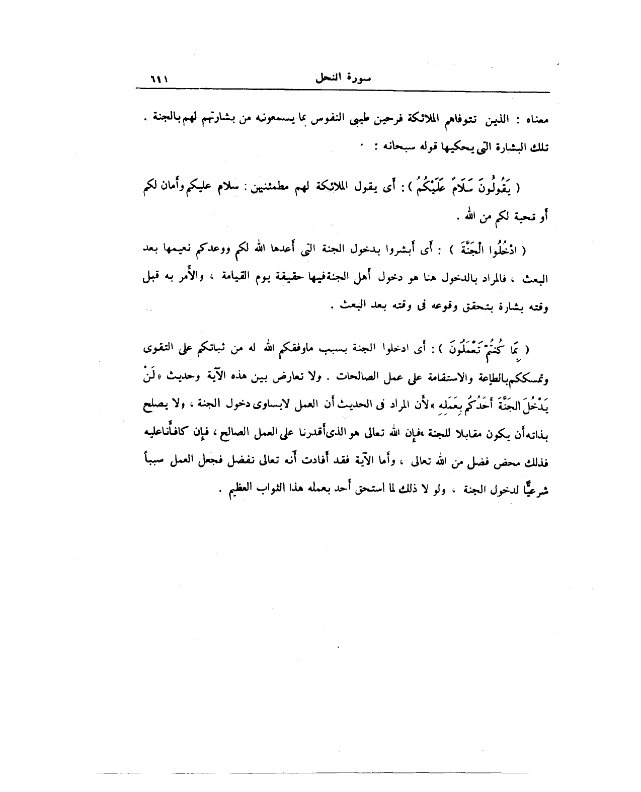 {بِمَا كُنْتُمْ تَعْمَلُونَ}: أي ادخلوا الجنة بسبب ما وفقكم الله له من ثباتكم على التقوى وتمسككم بالطاعة والاستقامة على عمل الصالحات. ولا تعارض بين هذه الآية وحديث "لَن يَدْخُلَ الجَنَّةَ أحَدُكُم بِعَمَلِهِ" لأن المراد في الحديث أن العمل لا يساوى دخول الجنة، ولا يصلح بذاته أن يكون مقابلًا للجنة، فإن الله تعالى هو الذي أقدرنا على العمل الصالح، فإن كافأنا عليه فذلك محض فضل من الله تعالى، وأما الآية فقد أفادت أنه تعالى نفضل فجعل العمل سببًا شرعيا لدخول الجنة, ولولا ذلك لما استحق أحد بعمله هذا الثواب العظيم.