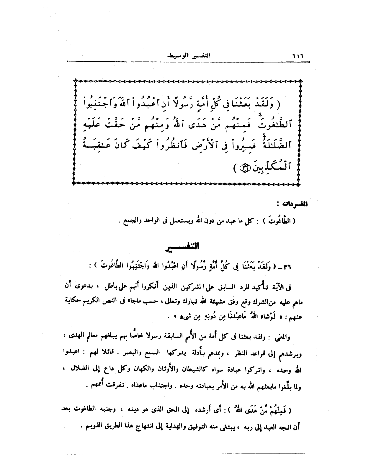 {وَلَقَدْ بَعَثْنَا فِي كُلِّ أُمَّةٍ رَسُولًا أَنِ اعْبُدُوا اللَّهَ وَاجْتَنِبُوا الطَّاغُوتَ فَمِنْهُمْ مَنْ هَدَى اللَّهُ وَمِنْهُمْ مَنْ حَقَّتْ عَلَيْهِ الضَّلَالَةُ فَسِيرُوا فِي الْأَرْضِ فَانْظُرُوا كَيْفَ كَانَ عَاقِبَةُ الْمُكَذِّبِينَ (36)}