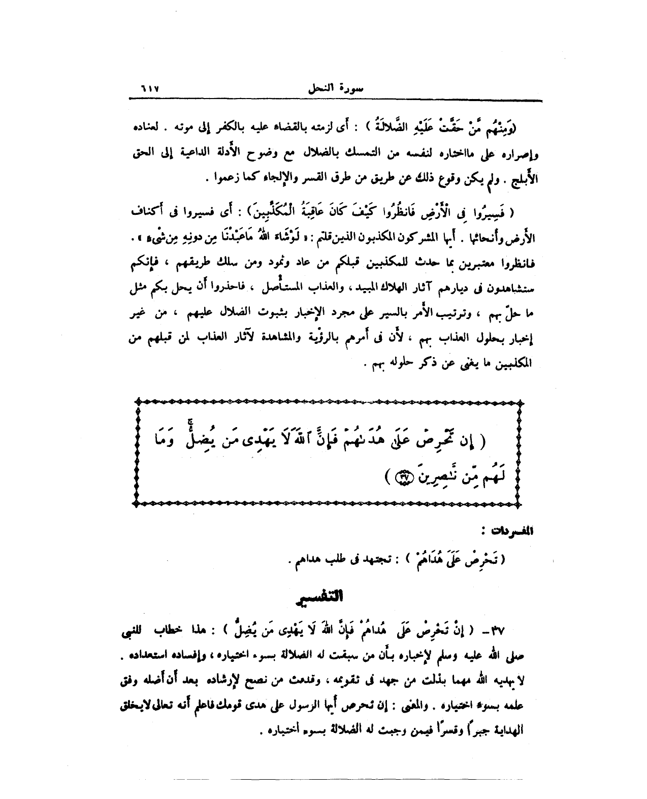 37 - {إِنْ تَحْرِصْ عَلَى هُدَاهُمْ فَإِنَّ اللَّهَ لَا يَهْدِي مَنْ يُضِلُّ}: هذا خطاب للنبي صلى الله عليه وسلم لإخباره بأن من سبقت له الضلالة بسوء اختياره، وإفساده استعداده. لا يهديه الله مهما بذلت من جهد في تقويمه، وقدمت من نصح لإشاده بعد أن أضله وفق علمه بسوء اختياره. والمعنى: إن تحرص أيها الرسول على هدى قومك فاعلم أنه تعالى لا يخلق الهداية جبرًا وقسرًا فيمن وجبت له الضلالة بسوء اختياره.
