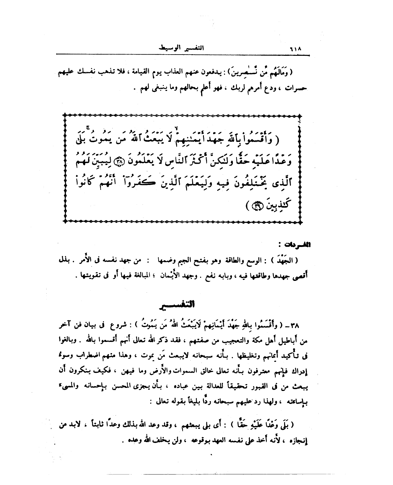 {وَأَقْسَمُوا بِاللَّهِ جَهْدَ أَيْمَانِهِمْ لَا يَبْعَثُ اللَّهُ مَنْ يَمُوتُ بَلَى وَعْدًا عَلَيْهِ حَقًّا وَلَكِنَّ أَكْثَرَ النَّاسِ لَا يَعْلَمُونَ (38) لِيُبَيِّنَ لَهُمُ الَّذِي يَخْتَلِفُونَ فِيهِ وَلِيَعْلَمَ الَّذِينَ كَفَرُوا أَنَّهُمْ كَانُوا كَاذِبِينَ (39)}