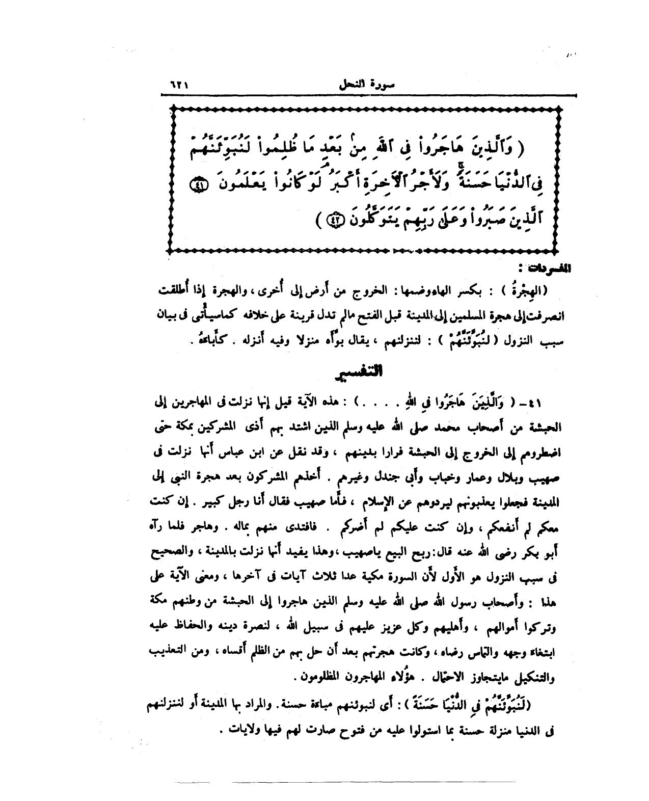 (الهِجرةُ): بكسر الهاء وضمها: الخروج من أرض إلى أخرى، والهجرة إذا أطلقت انصرفت إلى هجرة المسلمين إلى المدينة قبل الفتح ما لم تدل قرينة علي خلافه كما سيأتي في بيان سبب النزول {لَنُبَوِّئَنَّهُمْ}: لننزلنهم، يقال بوَّأه منزلا وفيه أنزله. كأباءه.