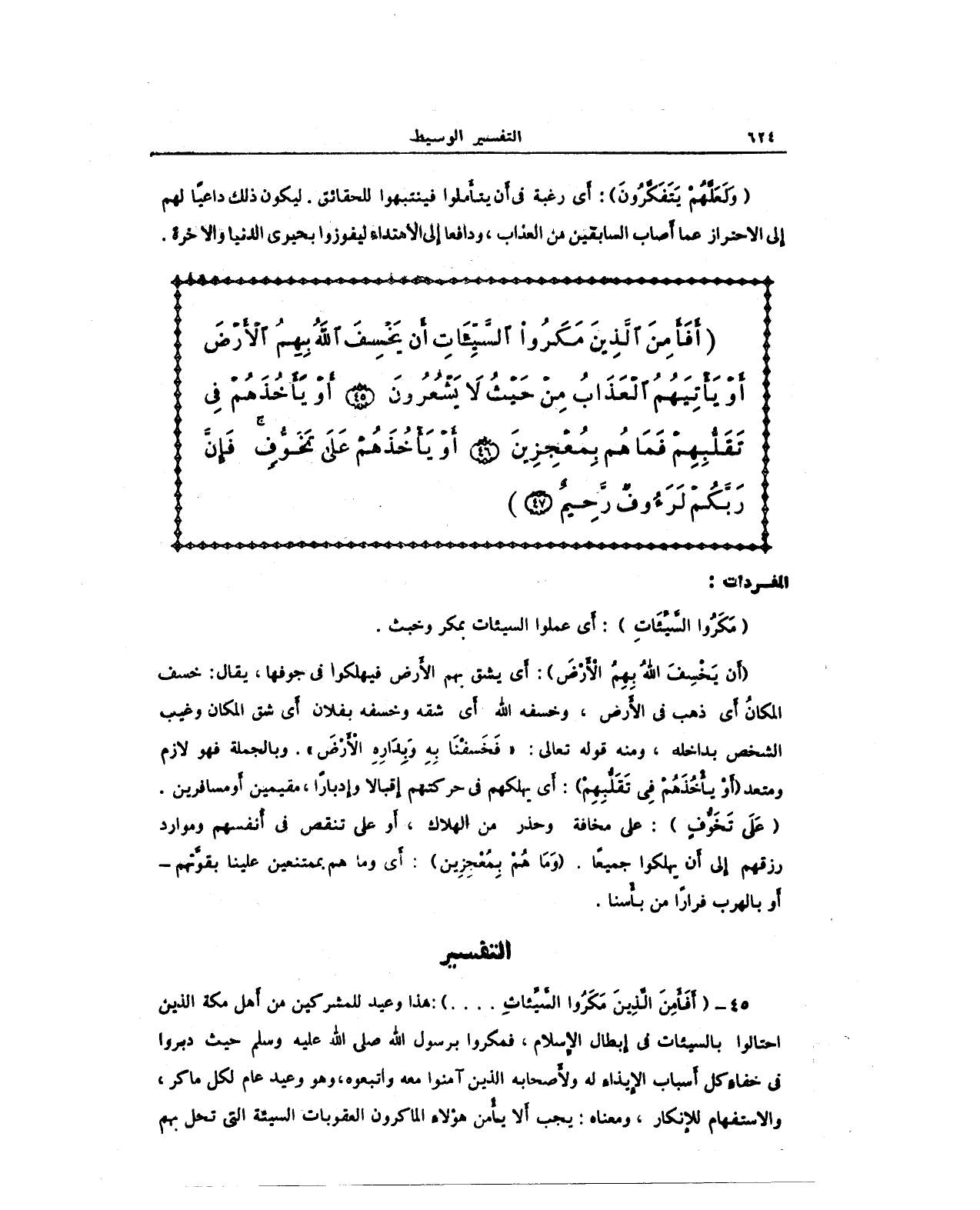 45 - {أَفَأَمِنَ الَّذِينَ مَكَرُوا السَّيِّئَاتِ ... }: هذا وعيد للمشركين من أهل مكة الذين احتالوا بالسيئات في إبطال الإِسلام، فمكروا برسول الله - صلى الله عليه وسلم - حيث دبروا في خفاء كل أسباب الإيذاء له ولأصحابه الذين آمنوا معه واتبعوه، وهو وعيد عام لكل ماكر، والاستفهام للإنكار، ومعناه: يجب ألا يأمن هؤلاه الماكرون العقوبات السيئة التي تحل بهم