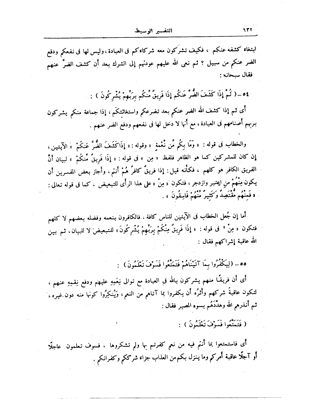 والخطاب في قوله: "وَمَا بِكُم مِّن نِّعْمة" وقوله: "إذَا كَشَفَ الضرَّ عَنكُمْ" الآيتين، إن كان للمشركين كما هو الظاهر فلفظ "مِن" في قوله: {إِذَا فَرِيقٌ مِنْكُمْ} لبيان أن الفريق الكافر هو كلهم، فكأنه قيل: إذا فريق كافرٌ هُمْ أنتم, وأَجاز بعض المفسرين أن يكون مِنْهم منِ اعتبر وازدجر، فتكون "مِنْ" على هذا الرأى للتبعيض, كما في قوله تعالى: {فَمِنْهُمْ مُهْتَدٍ وَكَثِيرٌ مِنْهُمْ فَاسِقُونَ}. (¬1)