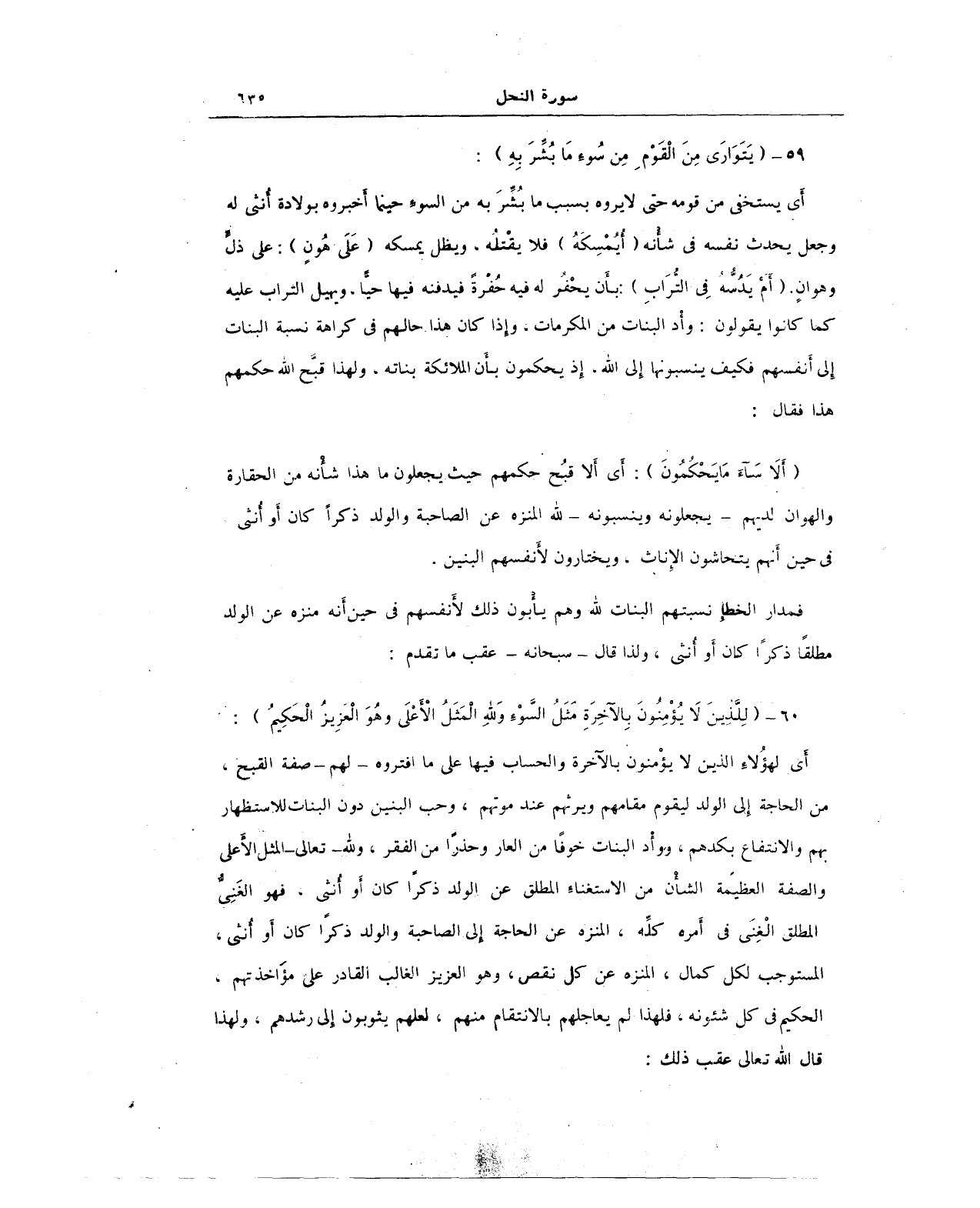 أَي يستخفي من قومه حتى لا يروه بسبب ما بُشِّرَ به من السوء حينما أخبروه بولادة أنثى له وجعل يحدث نفسه في شأنه {أَيُمْسِكُهُ} فلا يقْتلهُ. ويظل يمسكه {عَلَى هُونٍ}: على ذلٍّ وهوانٍ. {أَمْ يَدُسُّهُ فِي التُّرَابِ}: بأَن يحْفر له فيه حُفْرة فيدفنه فيها حيا. ويهيل التراب عليه كما كانوا يقول: وأْد البنات من المكرمات, وإذا كان هذا حالهم في كراهة نسبة البنات إِلى أَنفسهم فكيف ينسبونها إِلى الله, إِذ يحكمون بأَن الملائكة بناته، ولهذا قبح الله حكمهم هذا فقال: