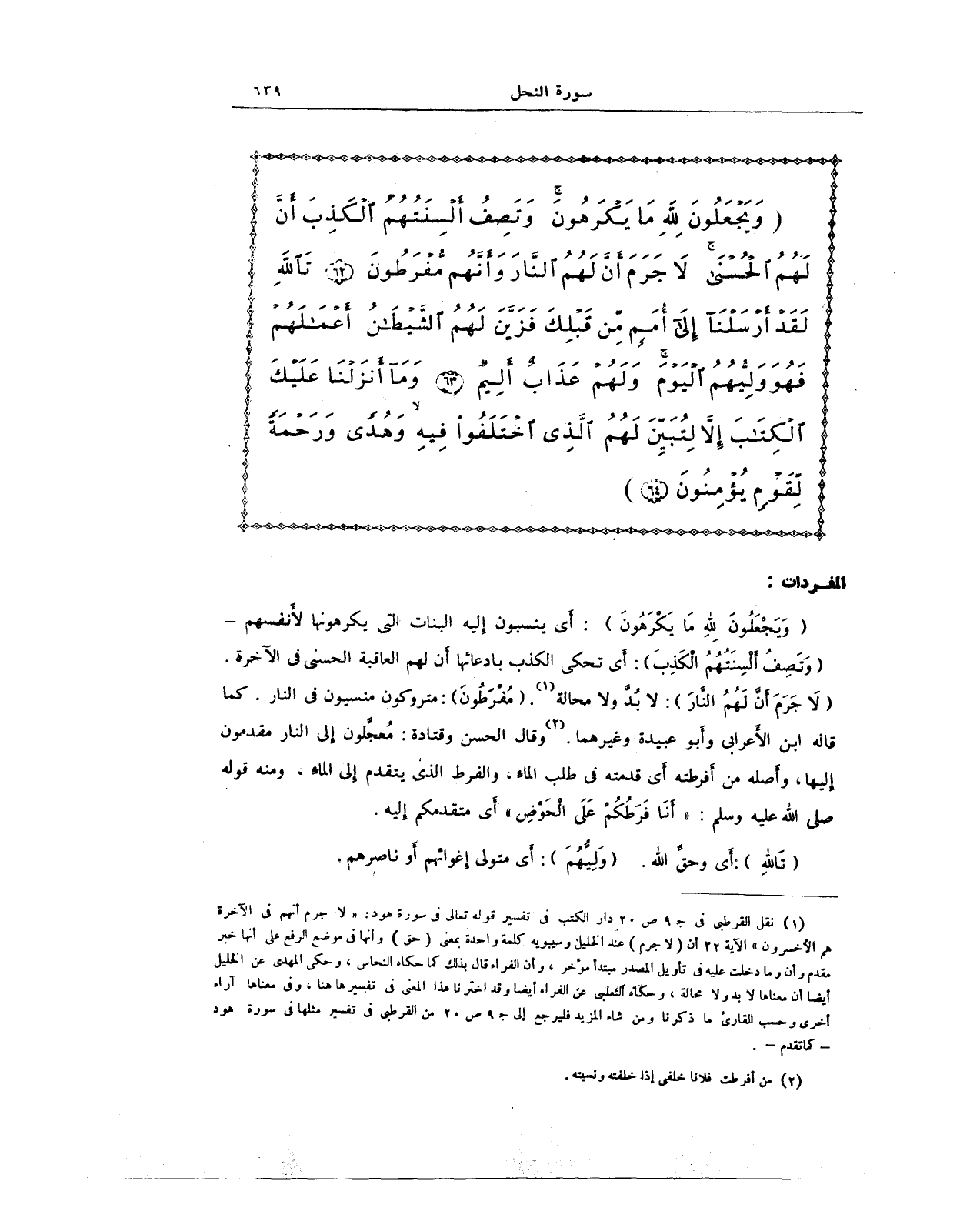 (¬1) نقل القرطبي في جـ 9 ص 20 دار الكتب في تفسير قوله تعالى في سورة هود: "لا جرم أنهم في الآخرة هم الأخسرون" الآية 22 أن {لَا جَرَمَ} عند الخليل وسيبويه كلمة واحدة بمعنى (حق) وأنها في موضع الرفع على أنها خبر مقدم وأن وما دخلت عليه في تأويل المصدر مبتدأ مؤخر، وأن الفراء قال بذلك كما حكاه الناس، وحكى المهدي عن الخليل أيضا أن معناها لا بد ولا محالة، وحكاه الثعلبي عن الفراء أيضًا وقد اخترنا هذا المعنى في تفسيرها هنا، وفي معناها آراء أخرى وحسب القارئ ما ذكرنا ومن شاء المزيد فليرجع إلى جـ 9 ص 20 من القرطبي في تفسير مثلها في سورة هود - كما تقدم -.