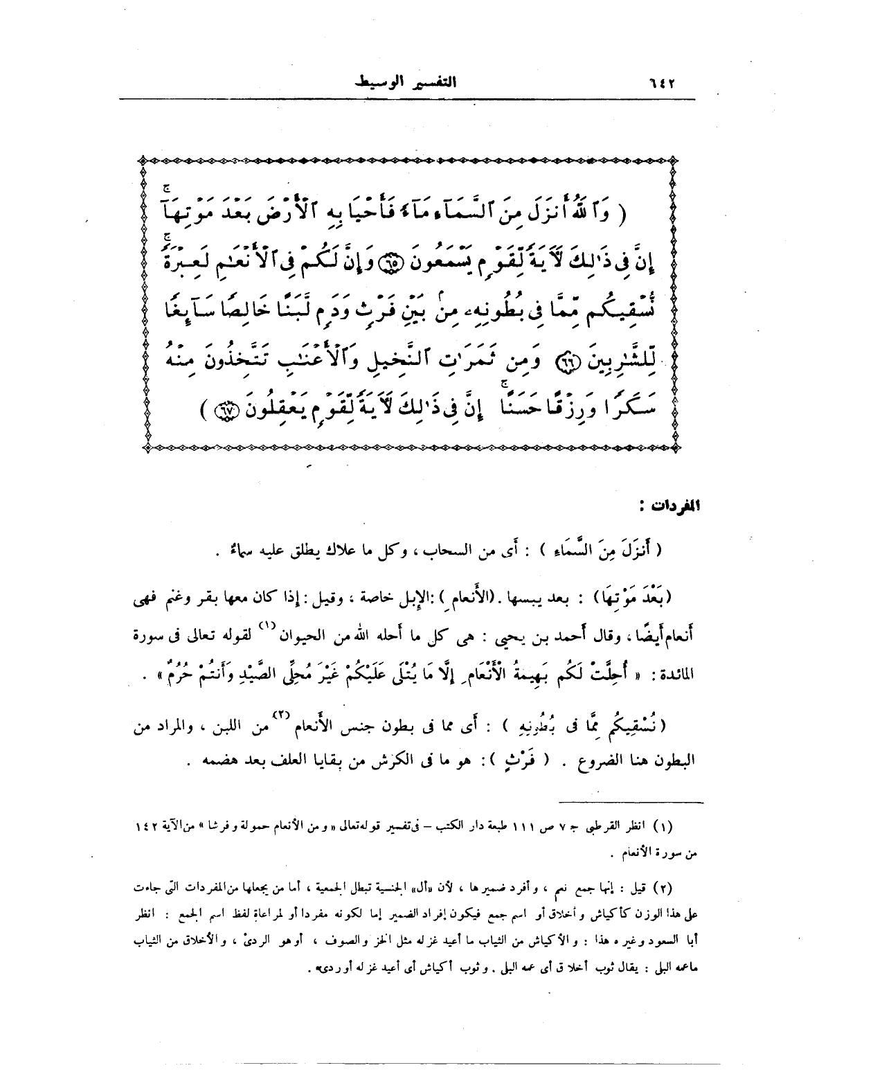 {بَعْدَ مَوْتِهَا}: بعد يبسها. {الْأَنْعَامِ}: الإِبل خاصة, وقيل: إذا كان معها بقر وغنم فهي أنعام أيضًا وقال أحمد بن يحيى: هي كل ما أحله الله من الحيوان (¬1) لقوله تعالى في سورة المائدة: {أُحِلَّتْ لَكُمْ بَهِيمَةُ الْأَنْعَامِ إِلَّا مَا يُتْلَى عَلَيْكُمْ غَيْرَ مُحِلِّي الصَّيْدِ وَأَنْتُمْ حُرُمٌ}.