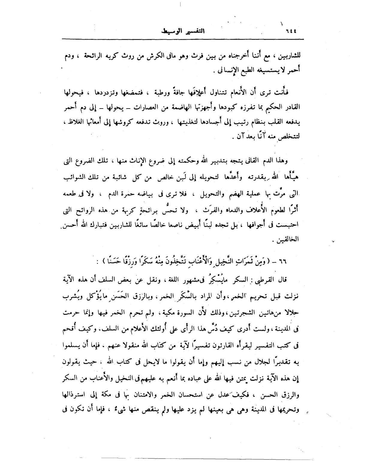 قال القرطبي: السكر ما يُسْكِرُ في مشهور اللغة، ونقل عن بعض السلف أن هذه الآية نزلت قبل تحريم الخمر، وأن المراد بالسكرِ الخمر, وبالرزق الحَسَنِ ما يُؤْكل ويُشرب حلالًا من هاتين الشجرتين، وذلك لأن السورة مكية, ولم تحرم الخمر فيها وإنما حرمت في المدينة، ولست أدري كيف دُسَّ هذا الرأى على أولئك الأعلام من السلف, وكيف أُقحم في كتب التفسير ليقرأه القارئون تفسيرًا لآية من كتاب الله منقولا عنهم، فإما أن يسلموا به تقديرًا لجلال من نسب إِليهم وإِما أن يقولوا ما لا يحل في كتاب الله، حيث يقولون إن هذه الآية نزلت يمتن فيها الله على عباده بما أَنعم به عليهم في النخيل والأعناب من السكر والرزق الحسن، فكيفَ عدل عن استحسان الخمر والامتنان بها في مكة إلى استرذالها وتحريمها في المدينة وهي هي بعينها لم يزد عليها ولم ينقص منها شيء، فإما أن تكون في