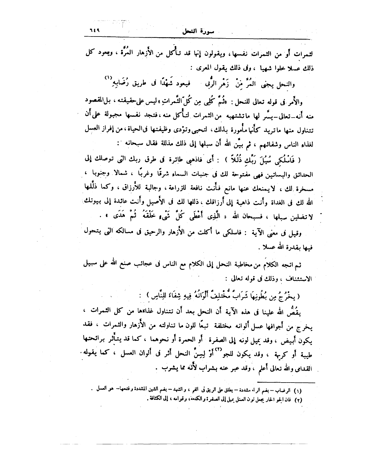 يقُصُّ الله علينا في هذه الآية أن النحل بعد أن تتناول غذاءها من كل الثمرات، يخرج من أَجوافها عسل ألوانه مختلفة تبعًا للون ما تناولته من الأزهار والثمرات، فقد يكون أبيض، وقد يميل لونه إلى الصفرة أو الحمرة أو نحوهما، كما قد يتأثر برائحتها طيبة أو كريهة، وقد يكون للجو (¬2) أَوْ لِسِنِّ النحل أثر في ألوان العسل، كما يقوله القدامى والله تعالى أعلم، وقد عبر عنه بشراب لأنه مما يشرب.