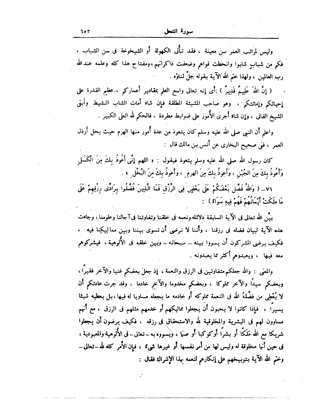 والمعنى: والله جعلكم متفاوتين فى الرزق والنعمة، إذ جعل بعضكم غنيا والآخر فقيرًا، وبعضكم سيدًا والآخر مملوكا، وبعضكم مخدوما والآخر خادما، وقد جرت عادتكم أَن لا يُعْطِي من فضَّلهُ الله في النعمة مملوكه أَو خادمه ما يجعله مساويا له فيها، بل يعطيه شيئا يسيرًا، فإذا كانوا لا يحبون أن يجعلوا مماليكهم أو خدمهم مثلهم فى الرزق، مع أنهم مساوون لهم فى البشرية والمخلوقية لله والاستحقاق رزقه، فكيف يرضون أن يجعلوا شريكا مع الله مَلَكًا أَو بشرًا أو كوكبا أو صنما، ويسووه به -تعالى- في الأُلوهية والمعبودية، فى حين أنها مخلوقة له وليس لها من أمر نفسها أو غيرها شيء، فإن الأمر كله لله -تعالى- وختم الله الآية بتوبيخهم على إنكارهم لنعمه بهذا الإشراك فقال: