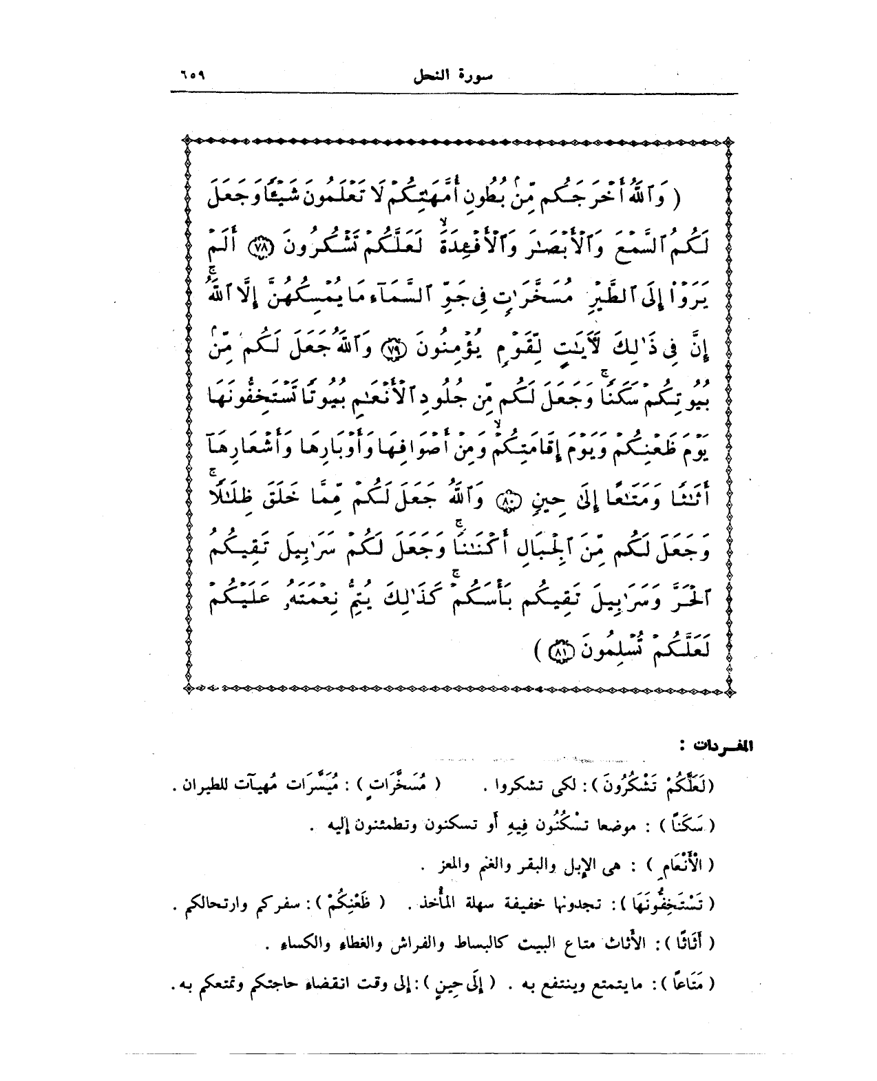 {وَاللَّهُ أَخْرَجَكُمْ مِنْ بُطُونِ أُمَّهَاتِكُمْ لَا تَعْلَمُونَ شَيْئًا وَجَعَلَ لَكُمُ السَّمْعَ وَالْأَبْصَارَ وَالْأَفْئِدَةَ لَعَلَّكُمْ تَشْكُرُونَ (78) أَلَمْ يَرَوْا إِلَى الطَّيْرِ مُسَخَّرَاتٍ فِي جَوِّ السَّمَاءِ مَا يُمْسِكُهُنَّ إِلَّا اللَّهُ إِنَّ فِي ذَلِكَ لَآيَاتٍ لِقَوْمٍ يُؤْمِنُونَ (79) وَاللَّهُ جَعَلَ لَكُمْ مِنْ بُيُوتِكُمْ سَكَنًا وَجَعَلَ لَكُمْ مِنْ جُلُودِ الْأَنْعَامِ بُيُوتًا تَسْتَخِفُّونَهَا يَوْمَ ظَعْنِكُمْ وَيَوْمَ إِقَامَتِكُمْ وَمِنْ أَصْوَافِهَا وَأَوْبَارِهَا وَأَشْعَارِهَا أَثَاثًا وَمَتَاعًا إِلَى حِينٍ (80) وَاللَّهُ جَعَلَ لَكُمْ مِمَّا خَلَقَ ظِلَالًا وَجَعَلَ لَكُمْ مِنَ الْجِبَالِ أَكْنَانًا وَجَعَلَ لَكُمْ سَرَابِيلَ تَقِيكُمُ الْحَرَّ وَسَرَابِيلَ تَقِيكُمْ بَأْسَكُمْ كَذَلِكَ يُتِمُّ نِعْمَتَهُ عَلَيْكُمْ لَعَلَّكُمْ تُسْلِمُونَ (81)}