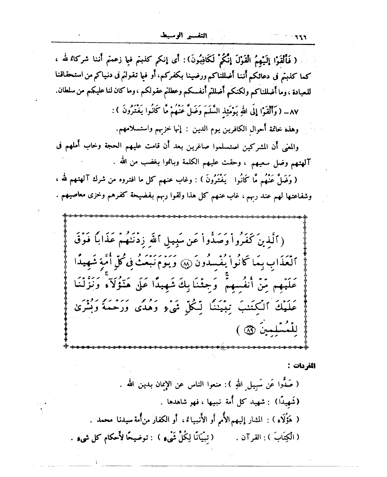 {الَّذِينَ كَفَرُوا وَصَدُّوا عَنْ سَبِيلِ اللَّهِ زِدْنَاهُمْ عَذَابًا فَوْقَ الْعَذَابِ بِمَا كَانُوا يُفْسِدُونَ (88) وَيَوْمَ نَبْعَثُ فِي كُلِّ أُمَّةٍ شَهِيدًا عَلَيْهِمْ مِنْ أَنْفُسِهِمْ وَجِئْنَا بِكَ شَهِيدًا عَلَى هَؤُلَاءِ وَنَزَّلْنَا عَلَيْكَ الْكِتَابَ تِبْيَانًا لِكُلِّ شَيْءٍ وَهُدًى وَرَحْمَةً وَبُشْرَى لِلْمُسْلِمِينَ (89)}