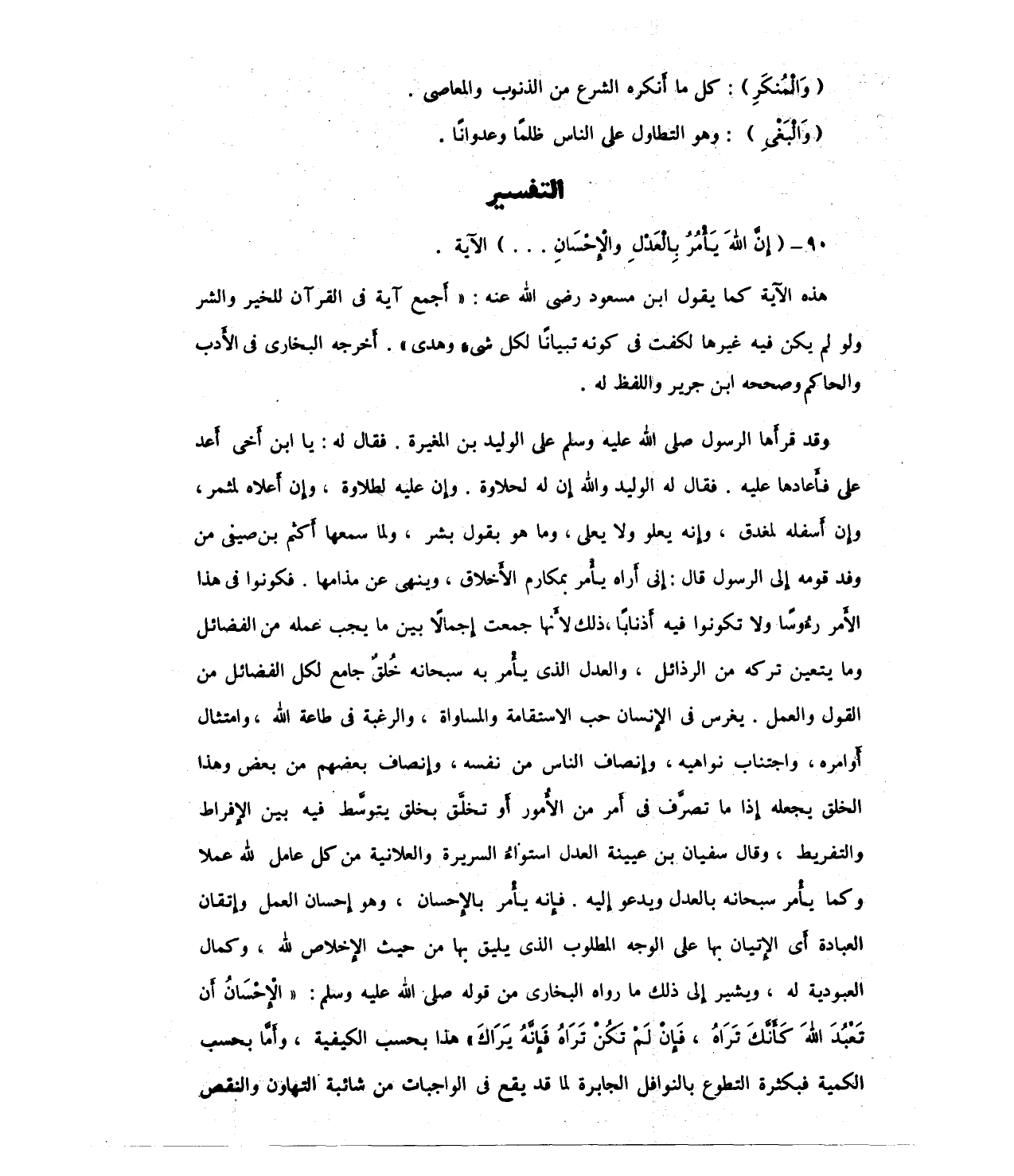 وقد قرأها الرسول صلى الله عليه وسلم على الوليد بن المغيرة. فقال له: يا ابن أَخى أعد على فأعادها عليه. فقال له الوليد والله إِن له لحلاوة. وإن عليه لطلاوة، وإن أَعلاه لمثمر، وإن أسفله لمغدق، وإنه يعلو ولا يعلى، وما هو بقول بشر، ولما سمعها أكثم بن صيفي من وفد قومه إِلى الرسول قال: إني أَراه يأمر بمكارم الأخلاق، وينهى عن مذامها. فكونوا فى هذا الأمر رءُوسًا ولا تكونوا فيه أَذنابًا، ذلك لأنها جمعت إجمالًا بين ما يجب عمله من الفضائل وما يتعين تركه من الرذائل، والعدل الذى يأمر به سبحانه خُلقٌ جامع لكل الفضائل من القول والعمل. يغرس فى الإنسان حب الاستقامة والمساواة، والرغبة فى طاعة الله، وامتثال أوامره، واجتناب نواهيه، وإنصاف الناس من نفسه، وإِنصاف بعضهم من بعض وهذا الخلق يجعله إذا ما تصرَّف فى أَمر من الأمور أو تخلَّق بخلق يتوسَّط فيه بين الإفراط والتفريط، وقال سفيان بن عيينة العدل استواءُ السريرة والعلانية من كل عامل لله عملا وكما يأمر سبحانه بالعدل ويدعو إليه. فإنه يأمر بالإحسان، وهو إحسان العمل وإتقان العبادة أَى الإتيان بها على الوجه المطلوب الذى يليق بها من حيث الإخلاص لله، وكمال العبودية له، ويشير إلى ذلك ما رواه البخاري من قوله صلى الله عليه وسلم: "الإحْسَانُ أن تَعْبُدَ اللهَ كَأنَّكَ تَرَاهُ، فَإنْ لَم تكُنْ تَرَاهُ فَإنهُ يَرَاك" هذا بحسب الكيفية، وأَمَّا بحسب الكمية فبكثرة التطوع بالنوافل الجابرة لما قد يقع فى الواجبات من شائبة التهاون والنقص