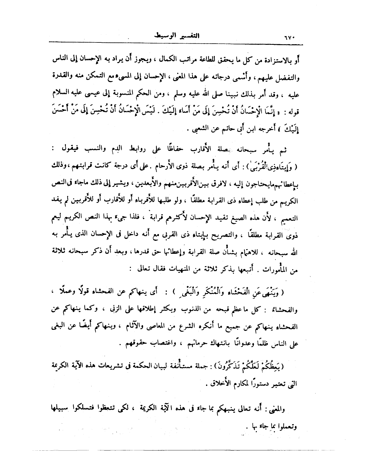 {وَإِيتَاءِ ذِي الْقُرْبَى}: أي أنه يأمر بصلة ذوى الأرحام. على أي درجة كانت قرابتهم، وذلك بإعطائهم ما يحتاجون إليه، لا فرق بين الأقربين منهم والأبعدين، ويشير إلى ذلك ما جاء في النص الكريم من طلب إعطاء ذى القرابة مطلقًا, ولو طلبها للأقرباء أو للأقارب أو للأقربين لم يفد التعميم؛ لأن هذه الصيغ تقيد الإحسان لأكثرهم قرابة، فلذا جيء بهذا النص الكريم ليعم ذوى القرابة مطلقا، والتصريح بإيتاء ذى القربى مع أنه داخل في الإِحسان الذي يأمر به الله سبحانه، للاهتمام بشأن صلة القرابة وإعطائها حق قدرها، وبعد أن ذكر سبحانه ثلاثة من المأمورات. أَتبعها بذكر ثلاثة من المنهيات فقال تعالى: