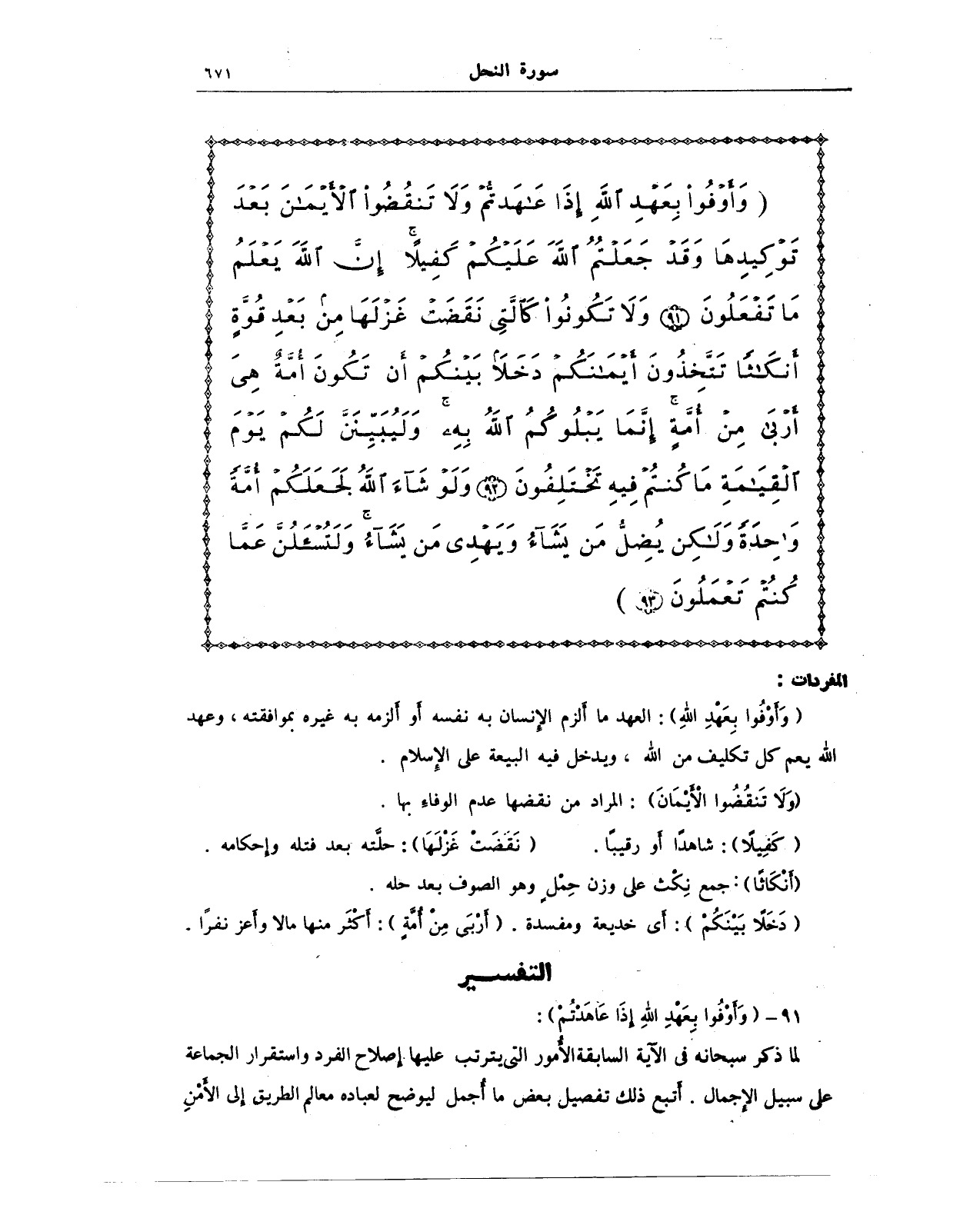 {وَأَوْفُوا بِعَهْدِ اللَّهِ إِذَا عَاهَدْتُمْ وَلَا تَنْقُضُوا الْأَيْمَانَ بَعْدَ تَوْكِيدِهَا وَقَدْ جَعَلْتُمُ اللَّهَ عَلَيْكُمْ كَفِيلًا إِنَّ اللَّهَ يَعْلَمُ مَا تَفْعَلُونَ (91) وَلَا تَكُونُوا كَالَّتِي نَقَضَتْ غَزْلَهَا مِنْ بَعْدِ قُوَّةٍ أَنْكَاثًا تَتَّخِذُونَ أَيْمَانَكُمْ دَخَلًا بَيْنَكُمْ أَنْ تَكُونَ أُمَّةٌ هِيَ أَرْبَى مِنْ أُمَّةٍ إِنَّمَا يَبْلُوكُمُ اللَّهُ بِهِ وَلَيُبَيِّنَنَّ لَكُمْ يَوْمَ الْقِيَامَةِ مَا كُنْتُمْ فِيهِ تَخْتَلِفُونَ (92) وَلَوْ شَاءَ اللَّهُ لَجَعَلَكُمْ أُمَّةً وَاحِدَةً وَلَكِنْ يُضِلُّ مَنْ يَشَاءُ وَيَهْدِي مَنْ يَشَاءُ وَلَتُسْأَلُنَّ عَمَّا كُنْتُمْ تَعْمَلُونَ (93)}