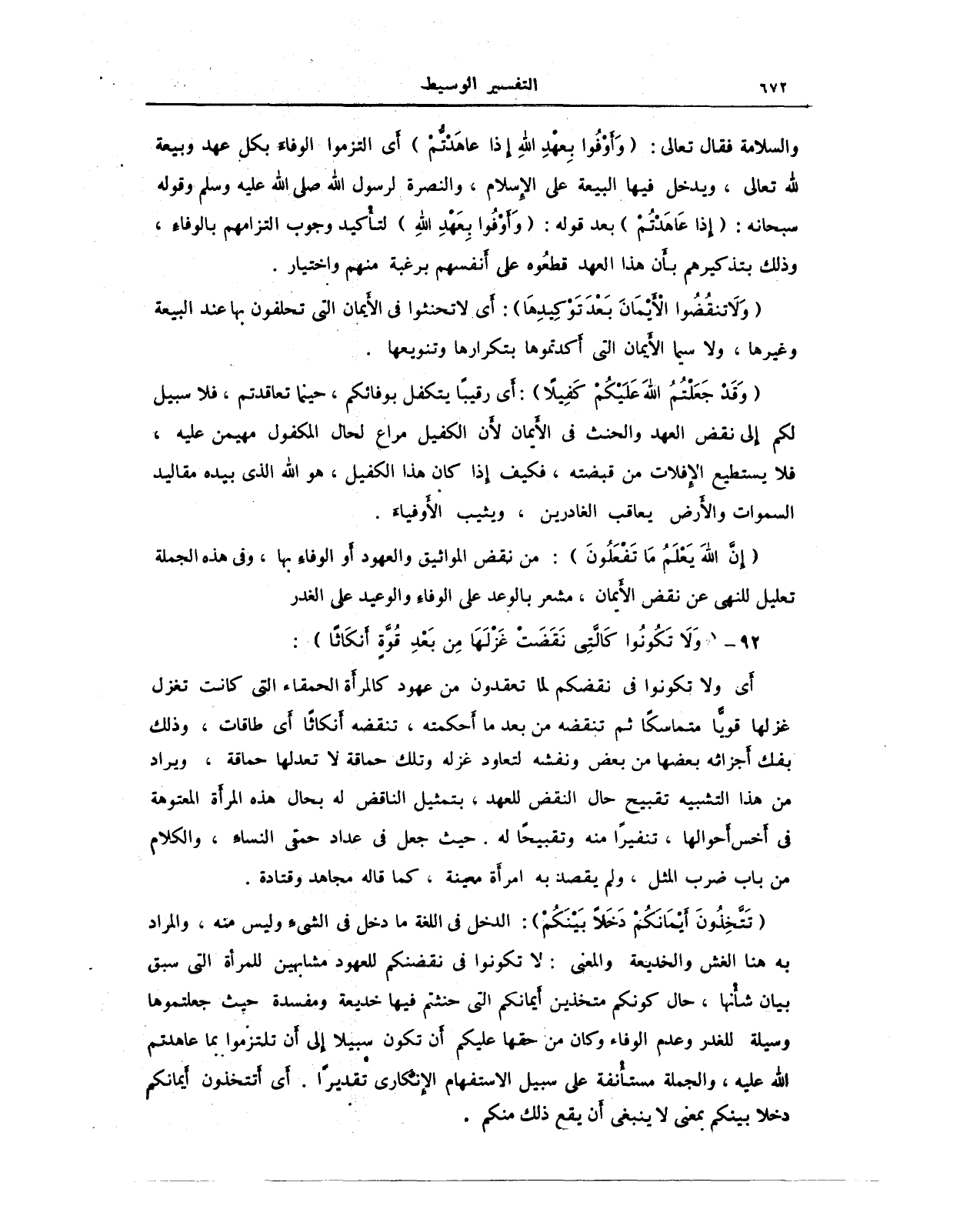 {وَلَا تَنْقُضُوا الْأَيْمَانَ بَعْدَ تَوْكِيدِهَا}: أي لا تحنثوا في الأيمان التي تحلفون بها عند البيعة وغيرها, ولا سيما الأيمان التي أَكدتموها بتكرارها وتنويعها.
