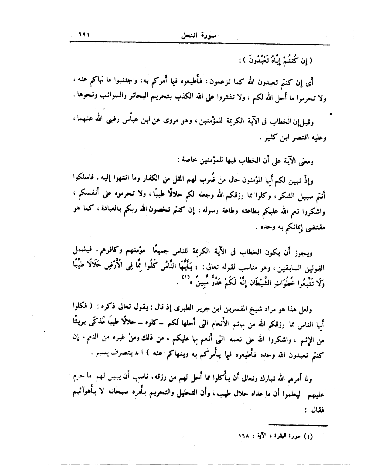ولعل هذا هو مراد شيخ المفسرين ابن جرير الطبرى إذ قال: يقول تعالى ذكره: (فكلوا أيها الناس مما رزقكم الله من بهائم الأنعام التي أحلها لكم - كلوه - حلالًا طيبا مُذكَي بريئًا من الإثم، واشكروا الله علي نعمه التي أنعم بها عليكم، من ذلك من غيره من النعم, إن كنتم تعبدون الله وحده فأطيعوه فما يأمركم به وينهاكم عنه) اهـ بتصرف يسير.
