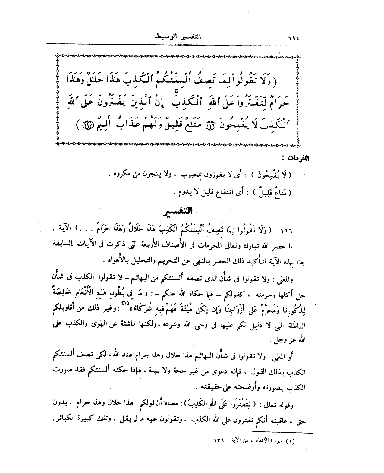 {وَلَا تَقُولُوا لِمَا تَصِفُ أَلْسِنَتُكُمُ الْكَذِبَ هَذَا حَلَالٌ وَهَذَا حَرَامٌ لِتَفْتَرُوا عَلَى اللَّهِ الْكَذِبَ إِنَّ الَّذِينَ يَفْتَرُونَ عَلَى اللَّهِ الْكَذِبَ لَا يُفْلِحُونَ (116) مَتَاعٌ قَلِيلٌ وَلَهُمْ عَذَابٌ أَلِيمٌ (117)}