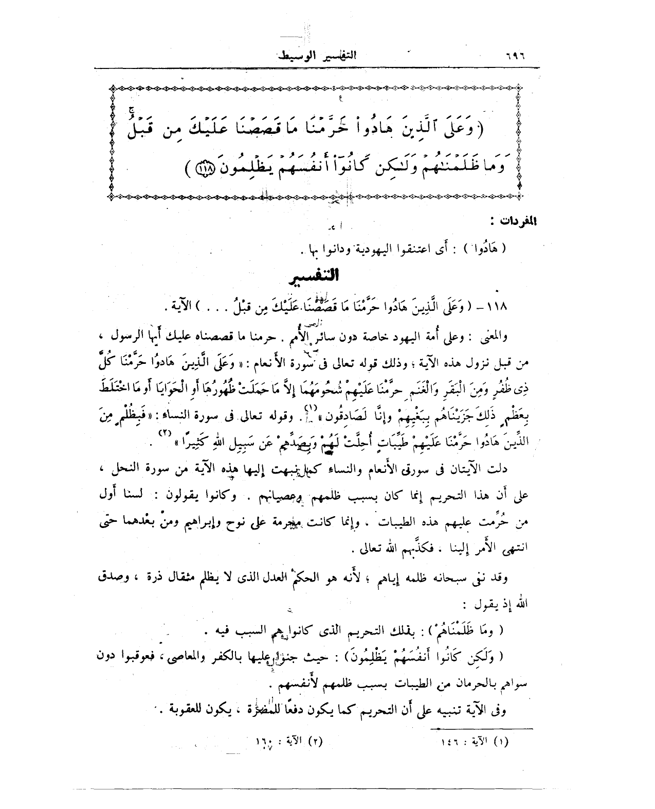 118 - {وَعَلَى الَّذِينَ هَادُوا حَرَّمْنَا مَا قَصَصْنَا عَلَيْكَ مِنْ قَبْلُ ... } الآية.