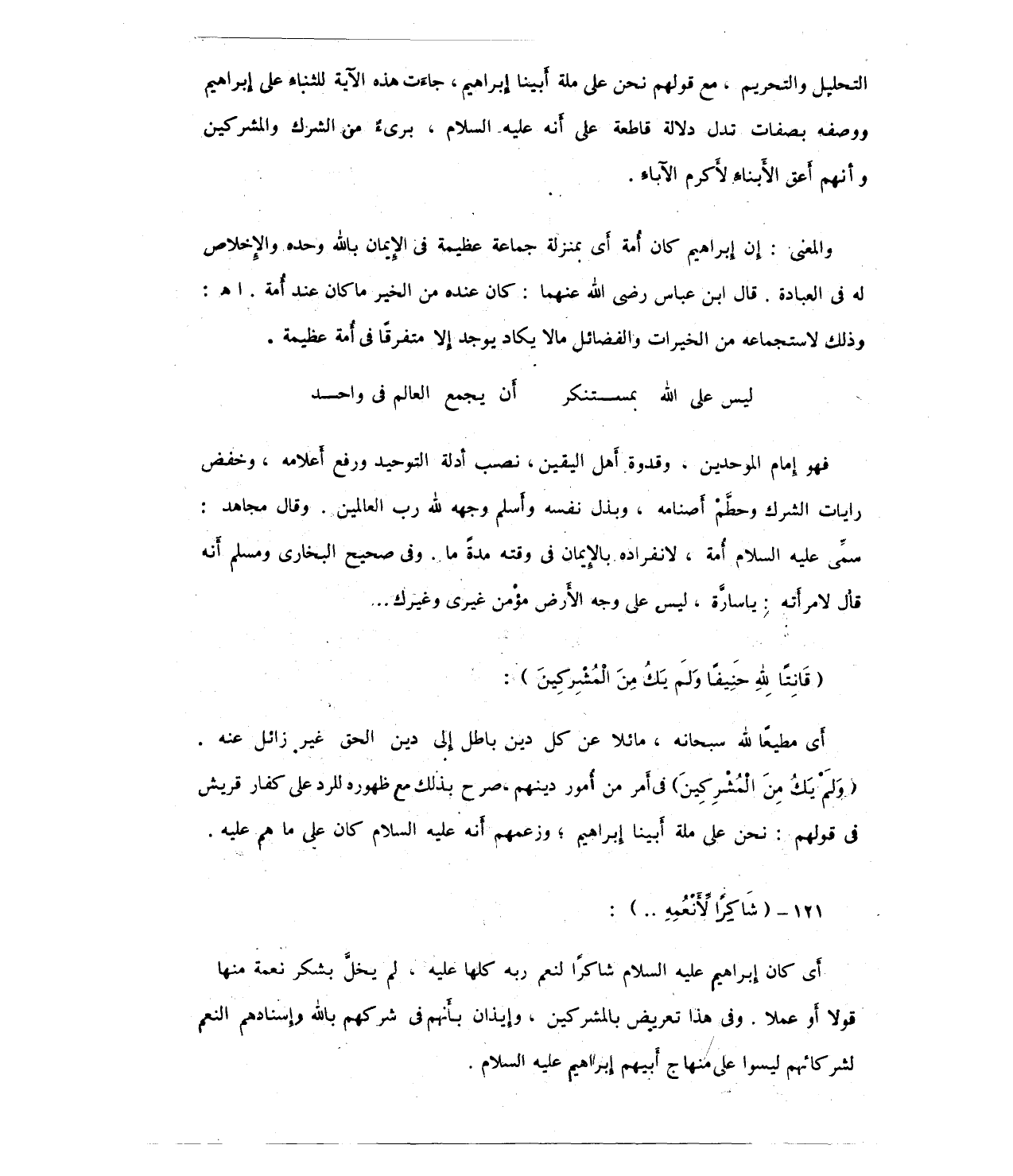 التحليل والتحريم, مع قولهم نحن على ملة أبينا إبراهيم، جاءَت هذه الآية للثناء على إِبراهيم ووصفه بصفات تدل دلالة قاطعة على أنه عليه السلام، بريءٌ من الشرك والمشركين وأنهم أعق الأبناء لأَكرم الآباء.