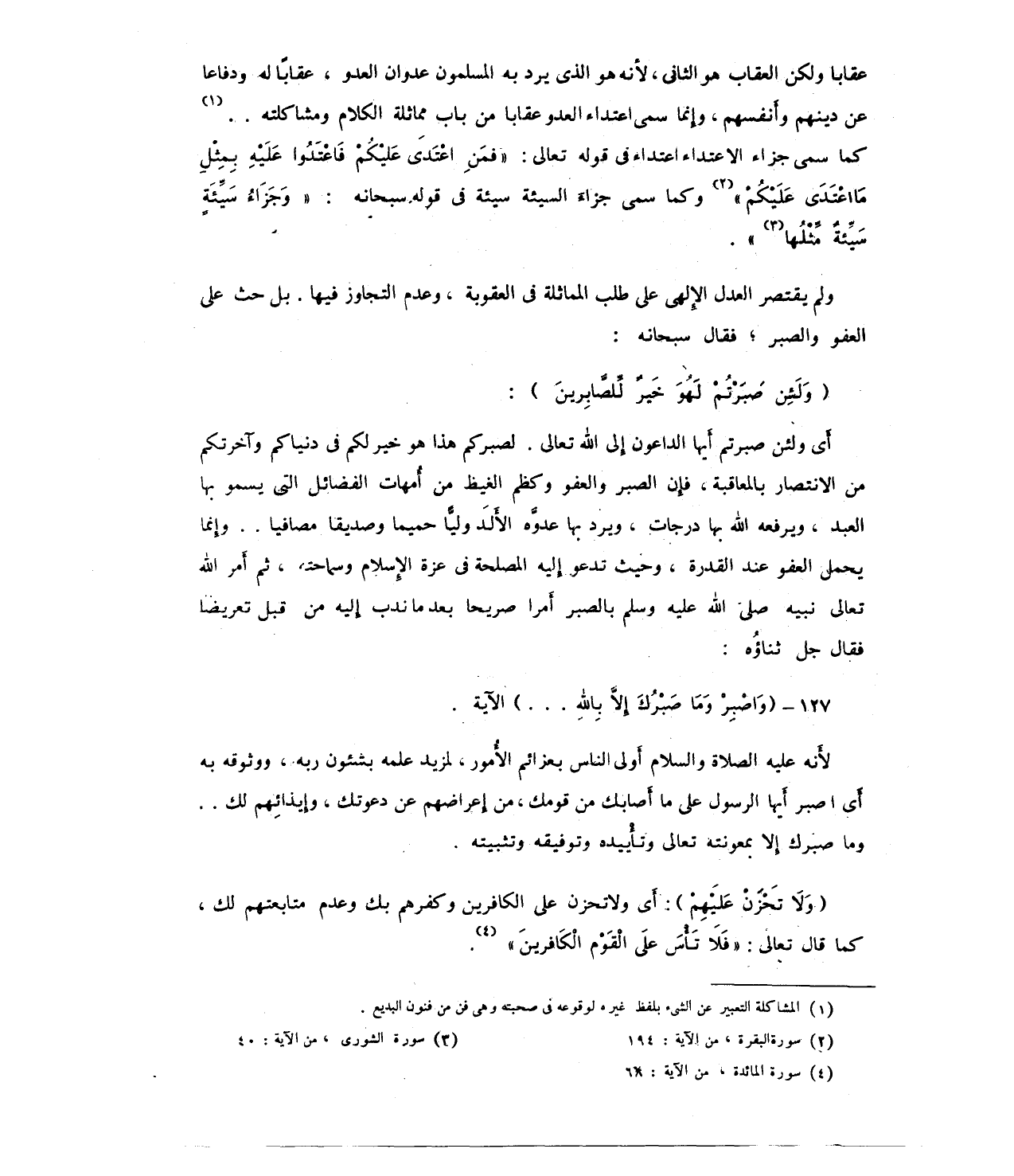 عقابا ولكن العقاب هو الثاني؛ لأنه هو الذي يرد به المسلمون عدوان العدو، عقابًا له ودفاعا عن دينهم وأَنفسهم، وإِنما سمى اعتداء العدو عقابا من باب مماثلة الكلام ومشاكلته .. (¬1) كما سمى جزاء الاعتداء اعتداء في قوله تعالى: {فَمَنِ اعْتَدَى عَلَيْكُمْ فَاعْتَدُوا عَلَيْهِ بِمِثْلِ مَا اعْتَدَى عَلَيْكُمْ} (¬2) وكما سمى جزاء السيئة سيئة في قوله سبحانه: {وَجَزَاءُ سَيِّئَةٍ سَيِّئَةٌ مِثْلُهَا} (¬3).