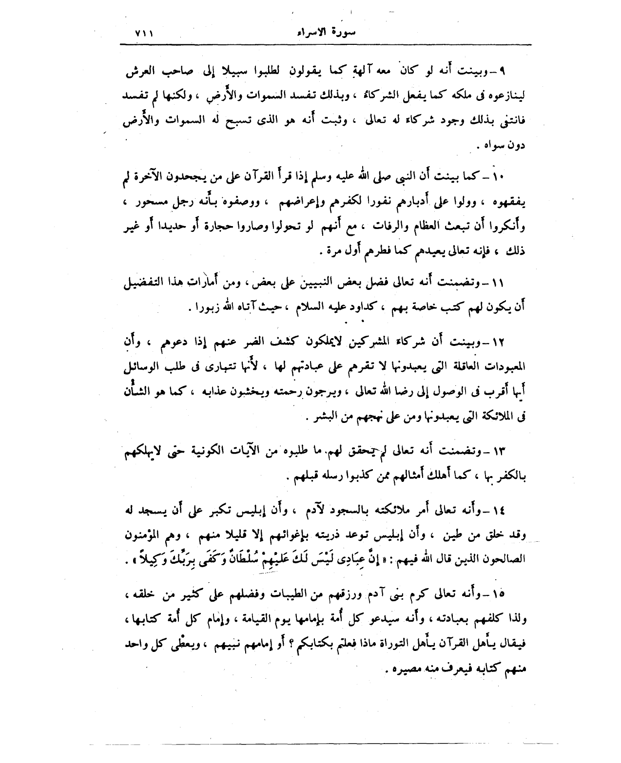 14 - وأَنه تعالى أمر ملائكته بالسجود لآدم، وأن إبليس تكبر على أن يسجد له وقد خلق من طين، وأن إبليس توعد ذريته بإغوائهم إلا قليلًا منهم، وهم المؤمنون الصالحون الذين قال الله فيهم: {إِنَّ عِبَادِي لَيْسَ لَكَ عَلَيْهِمْ سُلْطَانٌ وَكَفَى بِرَبِّكَ وَكِيلًا}.