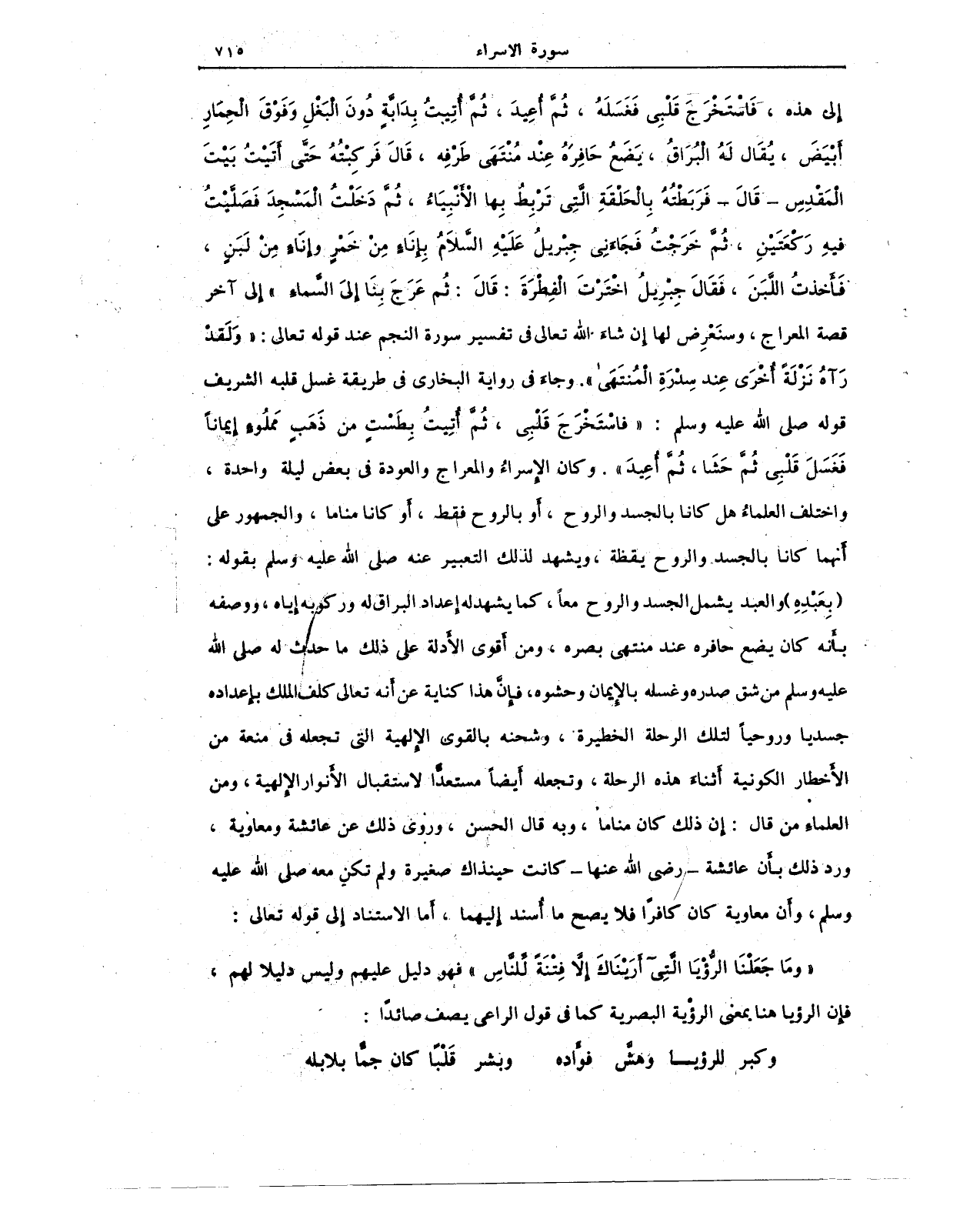 إِلى هذه، فَاستَخْرَجَ قَلْبِى فَغَسَلَة، ثُمَّ أعِيدَ، ثُم أتِيتُ بِدَابةٍ دُونَ البَغْلِ وَفَوْقَ الحِمَارِ أَبْيَضَ، يقَال لَهُ البُراق، يضَعُ حَافِرَهُ عِنْد مُنْتَهى طَرفِه، قَالَ فَركِبتهُ حَتى أتَيتُ بَيْتَ الْمَقْدِسِ - قالَ - فرَبَطْتُهُ بِالحَلقَةِ التِى تَرْبِطُ بِها الأنْبِيَاءُ، ثُم دخلْت المَسجِدَ فصَليْت فيهِ رَكْعَتَينِ، ثُمَّ خَرَجتُ فَجَاءني جِبْريلُ عَلَيْهِ السلاَمُ بِإنَاء مِنْ خمْرٍ وإناء مِن لبنٍ، فَأخذتُ اللَّبَنَ، فَقَالَ جِبرِيلُ اخْتَرتَ الفِطرَة: قَالَ: ثُم عَرَجَ بِنا إلىَ السماء" إلى آخر قصة المعراج، وسنَعْرِض لها إِن شاء الله تعالى في تفسير سورة النجم عند قوله تعالى: {وَلَقَدْ رَآهُ نَزْلَةً أُخْرَى (13) عِنْدَ سِدْرَةِ الْمُنْتَهَى}. وجاء في رواية البخاري في طريقة غسل قلبه الشريف قوله صلى الله عليه وسلم: "فاسْتَخْرَجَ قَلْبِى، ثُم أُتيتُ بِطَست من ذَهَب مَملوء إيمانًا فَغَسلَ قَلْبِى ثُمَّ حَشَا، ثُمَّ أعِيدَ". وكان الإسراءُ والمعراج والعودة في بعض ليلة واحدة، واختلف العلماءُ هل كانا بالجسد والروح، أَو بالروح فقط، أَو كانا مناما، والجمهور على أَنهما كانا بالجسد والروح يقظة، ويشهد لذلك التعبير عنه صلى الله عليه وسلم بقوله: (بِعَبْدِهِ) والعبد يشمل الجسد والروح معا، كما يشهد له إعداد البراق له وركوبه إياه، ووصفه بأنه كان يضع حافره عند منتهى بصره، ومن أقوى الأدلة على ذلك ما حدث له صلى الله عليه وسلم من شق صدره وغسله بالإيمان وحشوه، فإنَّ هذا كناية عن أنه تعالى كلف الملك بإعداده جسديا وروحيًا لتلك الرحلة الخطيرة، وشحنه بالقوى الإلهية التي تجعله في منعة من الأخطار الكونية أَثناء هذه الرحلة, وتجعله أيضًا مستعدا لاستقبال الأنوار الإلهية، ومن العلماء من قال: إن ذلك كان مناما، وبه قال الحسن، وروى ذلك عن عائشة ومعاوية، ورد ذلك بأن عائشة - رضي الله عنها - كانت حينذاك صغيرة ولم تكن معه صلى الله عليه وسلم، وأن معاوية كان كافرًا فلا يصح ما أسند إليهما، أَما الاستناد إلى قوله تعالى: