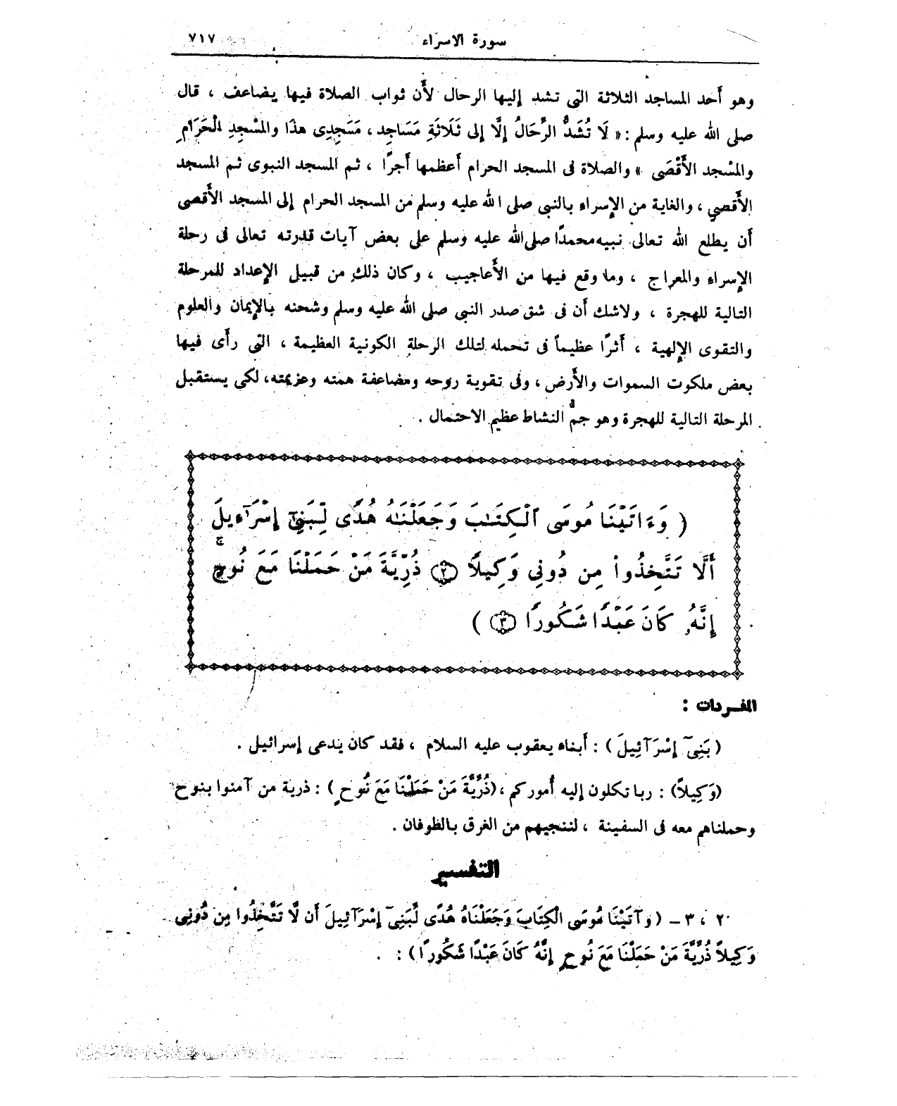 {وَآتَيْنَا مُوسَى الْكِتَابَ وَجَعَلْنَاهُ هُدًى لِبَنِي إِسْرَائِيلَ أَلَّا تَتَّخِذُوا مِنْ دُونِي وَكِيلًا (2) ذُرِّيَّةَ مَنْ حَمَلْنَا مَعَ نُوحٍ إِنَّهُ كَانَ عَبْدًا شَكُورًا}