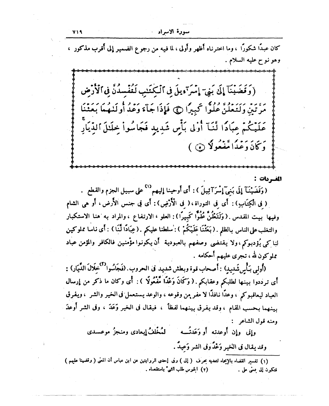 {فِي الْكِتَابِ}: أَي في التوراة، {فِي الْأَرْضِ}: أي في جنس الأرض، أو هي الشام وفيها بيت المقدس. {وَلَتَعْلُنَّ عُلُوًّا كَبِيرًا}: العلو، الارتفاع، والمراد به هنا الاستكبار والتغلب على الناس بالظلم. {بَعَثْنَا عَلَيْكُمْ}: سلطنا عليكم. {عِبَادًا لَنَا}: أَي ناسا مملوكين لنا كي يؤدبوكم، ولا يقتضى وصفهم بالعبودية أَن يكونوا مؤْمنين فالكافر والمؤمن عباد مملوكون لله، تجري عليهم أَحكامه.