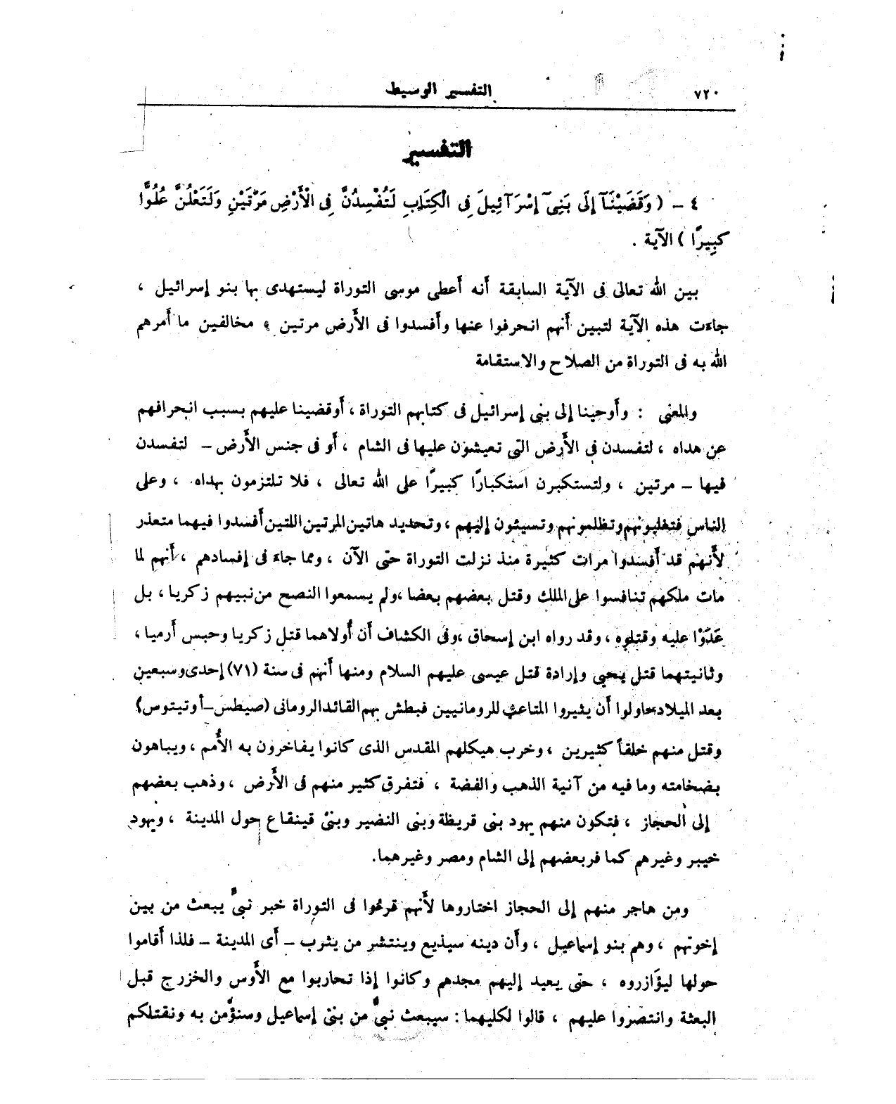 والمعنى: وأوحينا إِلى بني إسرائيل في كتابهم التوراة، أَو قضينا عليهم بسبب انحرافهم عن هداه، لتفسدن في الأرض التي تعيشون عليها في الشام، أو في جنس الأرض - لتفسدن فيها - مرتين، ولتستكبرن استكبارًا كبيرًا على الله تعالى، فلا تلتزمون بهداه، وعلى الناس فتغلبونهم وتظلمونهم وتسيئون إليهم، وتحديد هاتين المرتين اللتين أفسدوا فيهما متعذر لأنهم قد أفسدوا مرات كثيرة منذ نزلت التوراة حتى الآن، ومما جاء في إِفسادهم، أنهم لما مات ملكهم تنافسوا على الملك وقتل بعضهم بعضا, ولم يسمعوا النصح من نبيهم زكريا، بل عدوا عليه وقتلوه، وقد رواه ابن إسحاق، وفي الكشاف أن أولاهما قتل زكريا وحبس أَرميا، وثانيتهما قتل يحيى وإرادة قتل عيسى عليهم السلام ومنها أنهم في سنة (71) إحدى وسبعين بعد الميلاد حاولوا أَن يثيروا المتاعب للرومانيين فبطش بهم القائد الروماني (صيطس - أوتيتوس) وقتل منهم خلقًا كثيرين، وخرب هيكلهم المقدس الذي كانوا يفاخرون به الأمم، ويباهون بضخامته وما فيه من آنية الذهب والفضة، فتفرق كثير منهم في الأرض، وذهب بعضهم إلى الحجاز، فتكون منهم يهود بني قريظة وبني النضير وبني قينقاع حول المدينة، ويهود خيبر وغيرهم كما فر بعضهم إِلى الشام ومصر وغيرهما.