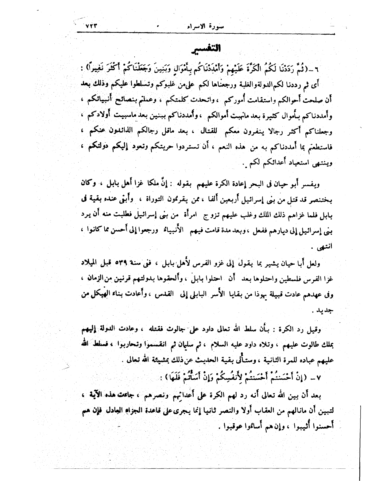 ويفسر أَبو حيان في البحر إعادة الكرة عليهم بقوله: إِن ملكا غزا أَهل بابل، وكان بختنصر قد قتل من بني إسرائيل أربعين ألفا، ممن يقرءون التوراة، وأبقى عنده بقية في بابل فلما غزاهم ذلك الملك وغلب عليهم تزوج امرأة من بني إِسرائيل فطلبت منه أن يرد بني إسرائيل إلى ديارهم ففعل، وبعد مدة قامت فيهم الأنبياء ورجعوا إلى أحسن مما كانوا، انتهى.