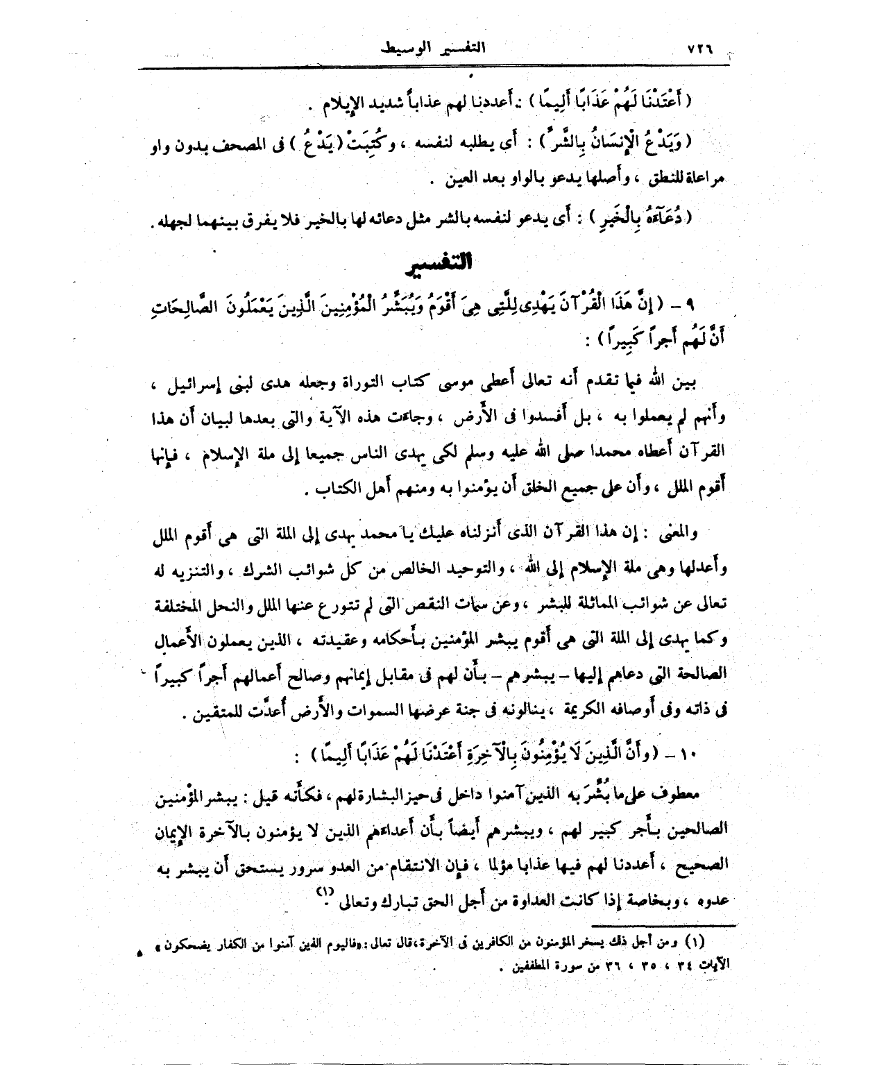 9 - {إِنَّ هَذَا الْقُرْآنَ يَهْدِي لِلَّتِي هِيَ أَقْوَمُ وَيُبَشِّرُ الْمُؤْمِنِينَ الَّذِينَ يَعْمَلُونَ الصَّالِحَاتِ أَنَّ لَهُمْ أَجْرًا كَبِيرًا}: