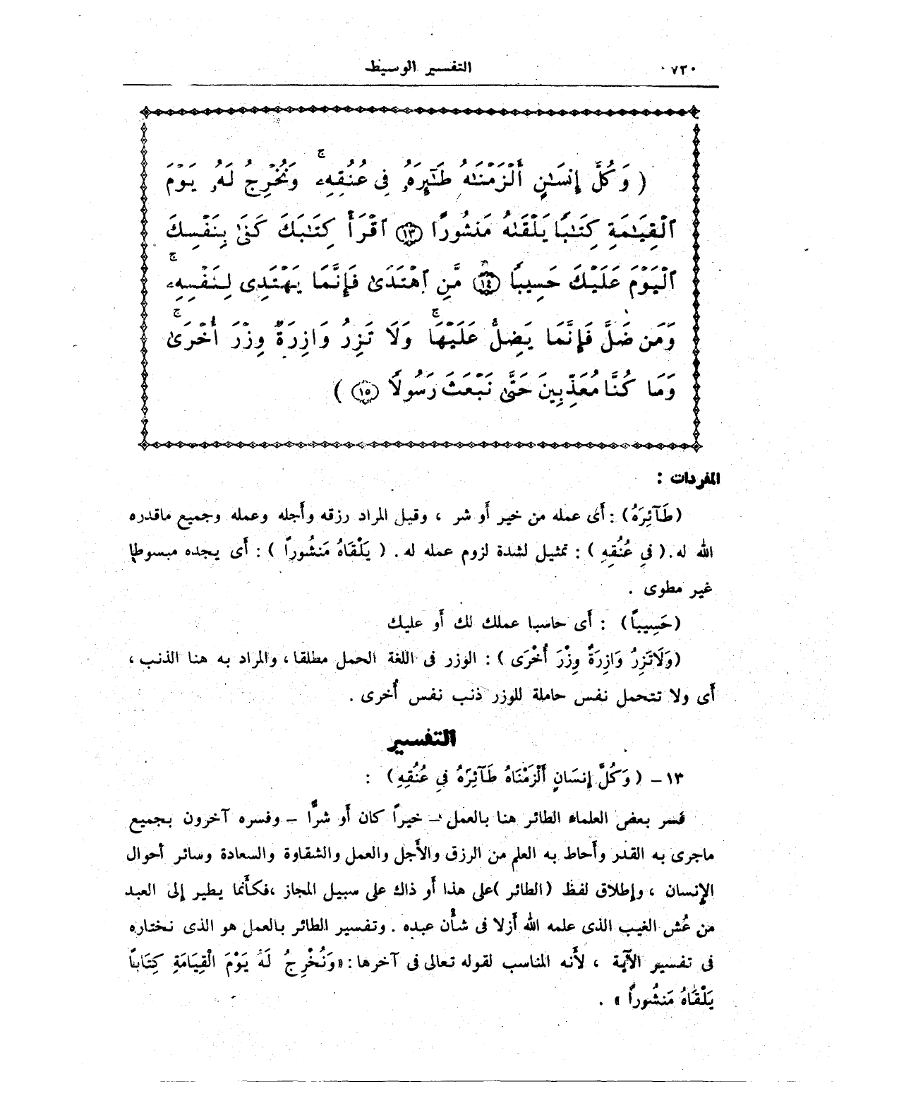 {طَائِرَهُ}: أَي عملة من خير أَو شر، وقيل المراد رزقه وأَجله وعمله وجميع ما قدره الله له. {فِي عُنُقِهِ}: تمثيل لشدة لزوم عمله له. {يَلْقَاهُ مَنْشُورًا}: أي يجده مبسوطا غير مطوى.