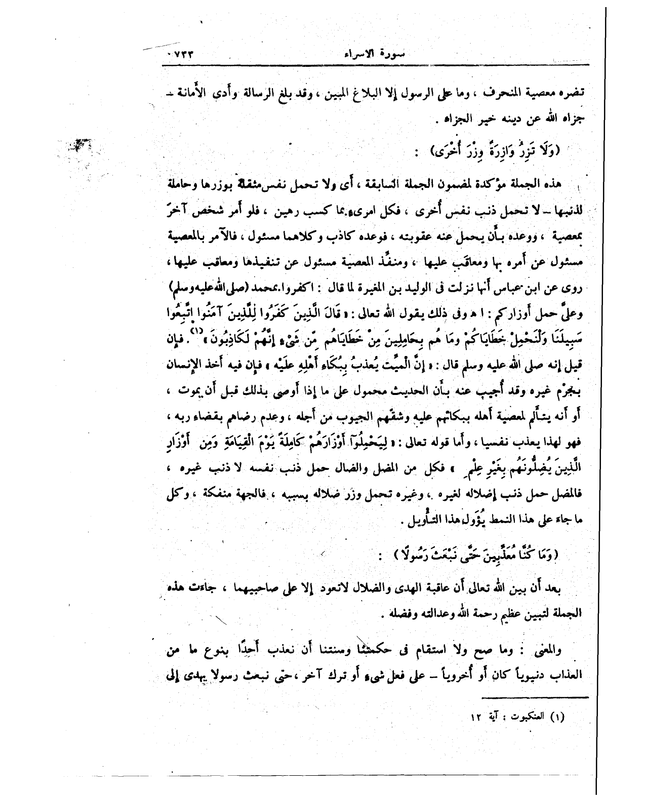 هذه الجملة مؤكدة لمضمون الجملة السابقة، أَي ولا تحمل نفس مثقلة بوزرها وحاملة لذنبها - لا تحمل ذنب نفس أخرى، فكل امرئ بما كسب رهين، فلو أَمر شخص آخرٌ بمعصية، ووعده بأن يحمل عنه عقوبته, فوعده كاذب وكلاهما مسئول، فالآمر بالمعصية مسئول عن أَمره بها ومعاقَب عليها، ومنفِّذ المعصية مسئول عن تنفيذها ومعاقب عليها، روى عن ابن عباس أَنها نزلت في الوليد بن االمغيرة لما قال: اكفروا بمحمد (صلى الله عليه وسلم) وعليَّ حمل أَوزاركم: اهـ وفي ذلك بقول الله تعالى: {قَالَ الَّذِينَ كَفَرُوا لِلَّذِينَ آمَنُوا اتَّبِعُوا سَبِيلَنَا وَلْنَحْمِلْ خَطَايَاكُمْ وَمَا هُمْ بِحَامِلِينَ مِنْ خَطَايَاهُمْ مِنْ شَيْءٍ إِنَّهُمْ لَكَاذِبُونَ} (¬1). فإن قيل إنه صلى الله عليه وسلم قال: "إِن الميت يُعذبُ بِبكَاء أَهْلِهِ عليه" فإن فيه أَخذ الإنسان بجزم غيره وقد أجيب عنه بأن الحديث محمول على ما إذا أَوصى بذلك قبل أَن يموت، أَو أنه يتألم لمعصية أَهله ببكائهم عليه وشقّهم الجيوب من أَجله، وعدم رضاهم بقضاء ربه، فهو لهذا يعذب نفسيا، وأَما قوله تعالى: {لِيَحْمِلُوا أَوْزَارَهُمْ كَامِلَةً يَوْمَ الْقِيَامَةِ وَمِنْ أَوْزَارِ الَّذِينَ يُضِلُّونَهُمْ بِغَيْرِ عِلْمٍ} فكل من المضل والضال حمل ذنب نفسه لا ذنب غيره، فالمضل حمل ذنب إضلاله لغيره، وغيره تحمل وزر ضلاله بسببه، فالجهة منفكة، وكل ما جاء على هذا النمط يُؤَول هذا التأويل.