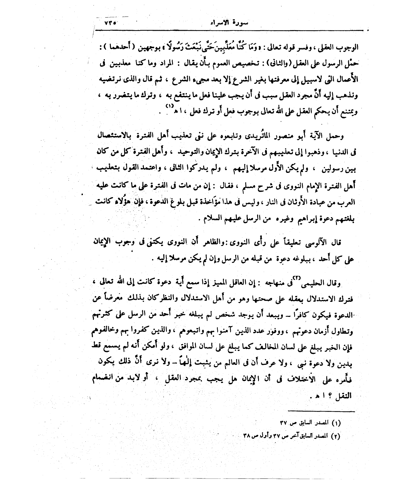 قال الآلوسى تعليقًا على رأي النووى: والظاهر أن النووي يكتفى في وجوب الإيمان على كل أحد، ببلوغه دعوة من قبله من الرسل وإِن لم يكن مرسلا إليه.