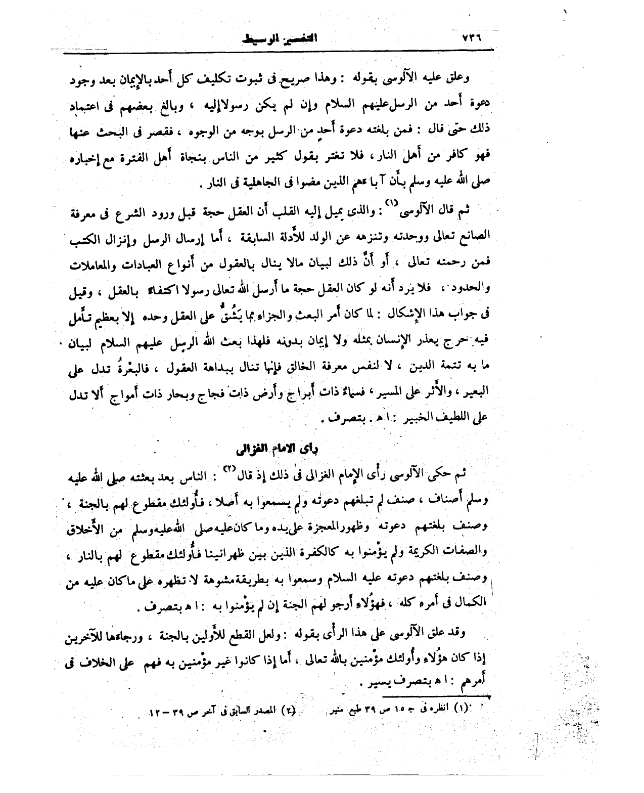 ثم حكى الآلوسي رأي الإمام الغزالي في ذلك إذ قال (¬2): الناس بعد بعثته صلى الله عليه وسلم أَصناف، صنف لم تبلغهم دعوته ولم يسمعوا به أَصلا، فأُولئك مقطوع لهم بالجنة، وصنف بلغتهم دعوته وظهور المعجزة على يده وما كان عليه صلى الله عليه وسلم من الأخلاق والصفات الكريمة ولم يؤْمنوا به كالكفرة الذين بين ظهرانينا فأولئك مقطوع لهم بالنار، وصنف بلغتهم دعوته عليه السلام وسمعوا به بطريقة مشوهة لا تظهره على ما كان عليه من الكمال في أَمره كله، فهؤُلاء أَرجو لهم الجنة إن لم يؤْمنوا به: اهـ بتصرف.