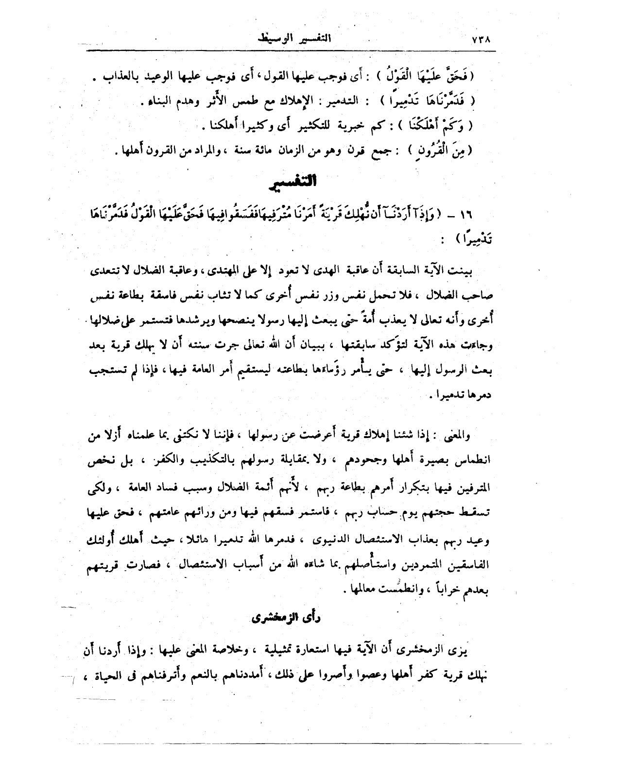والمعنى: إذا شئنا إهلاك قرية أعرضت عن رسولها، فإننا لا نكتفي بما علمناه أَزلا من انطماس بصيرة أهلها وجحودهم، ولا بمقابلة رسولهم بالتكذيب والكفر، بل نخص المترفين فيها بتكرار أَمرهم بطاعة ربهم، لأنهم أئمة الضلال وسبب فساد العامة، ولكى تسقط حجتهم يوم حساب ربهم، فاستمر فسقهم فيها ومن ورائهم عامتهم، فحق عليها وعيد ربهم بعذاب الاستئصال الدنيوى، فدمرها الله تدميرا هائلا، حيث أهلك أولئك الفاسقين المتمردين واستأصلهم بما شاءه الله من أَسباب الاستئصال، فصارت قريتهم بعدهم خرابًا، وانطمست معالمها.