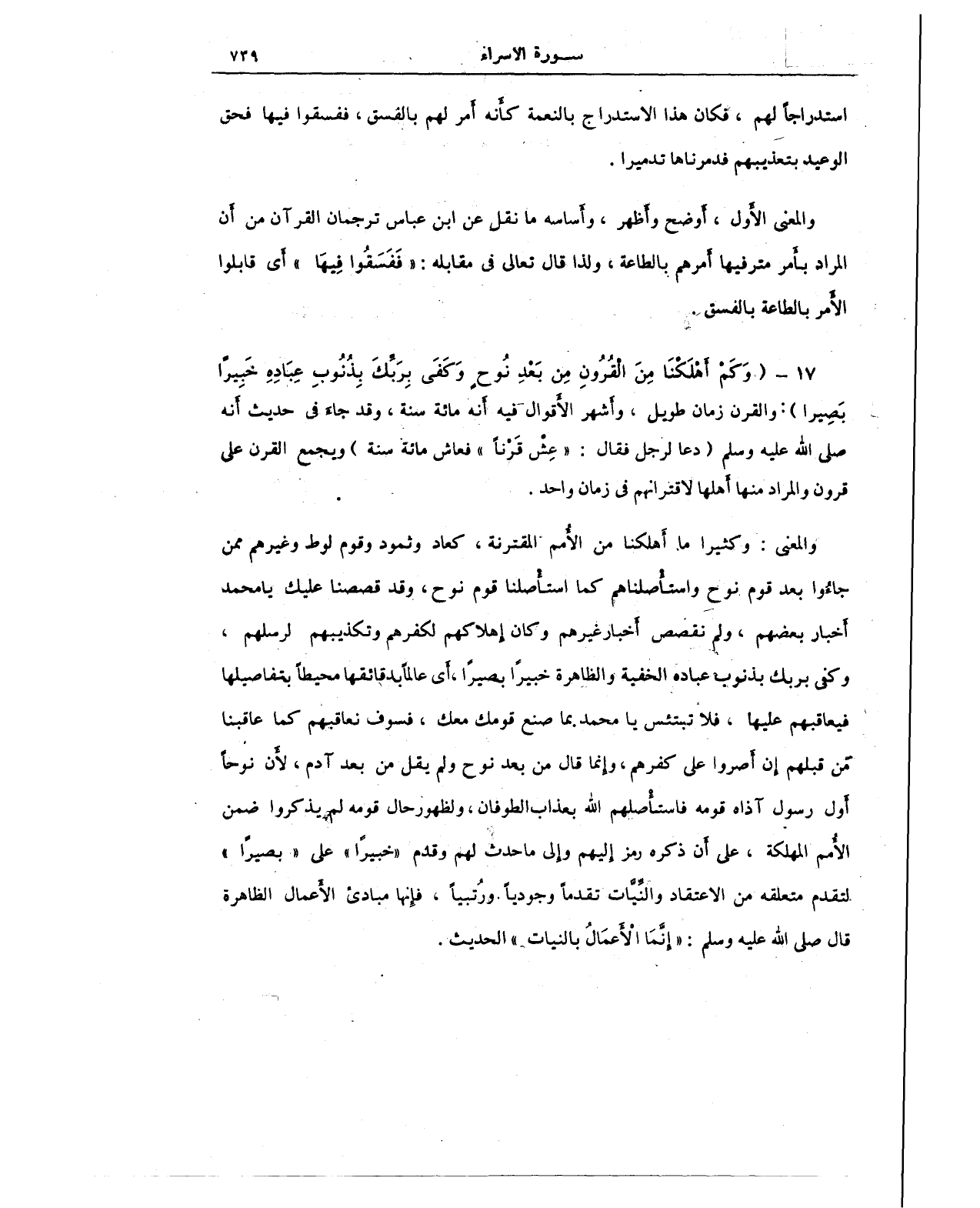 17 - {وَكَمْ أَهْلَكْنَا مِنَ الْقُرُونِ مِنْ بَعْدِ نُوحٍ وَكَفَى بِرَبِّكَ بِذُنُوبِ عِبَادِهِ خَبِيرًا بَصِيرًا}: والقرن زمان طويل، وأشهر الأقوال فيه أنه مائة سنة، وقد جاءَ في حديث أنه صلى الله عليه وسلم (دعا لرجل فقال: "عِش قرنًا" فعاش مائة سنة) ويجمع القرن على قرون والمراد منها أهلها لاقترانهم في زمان واحد.