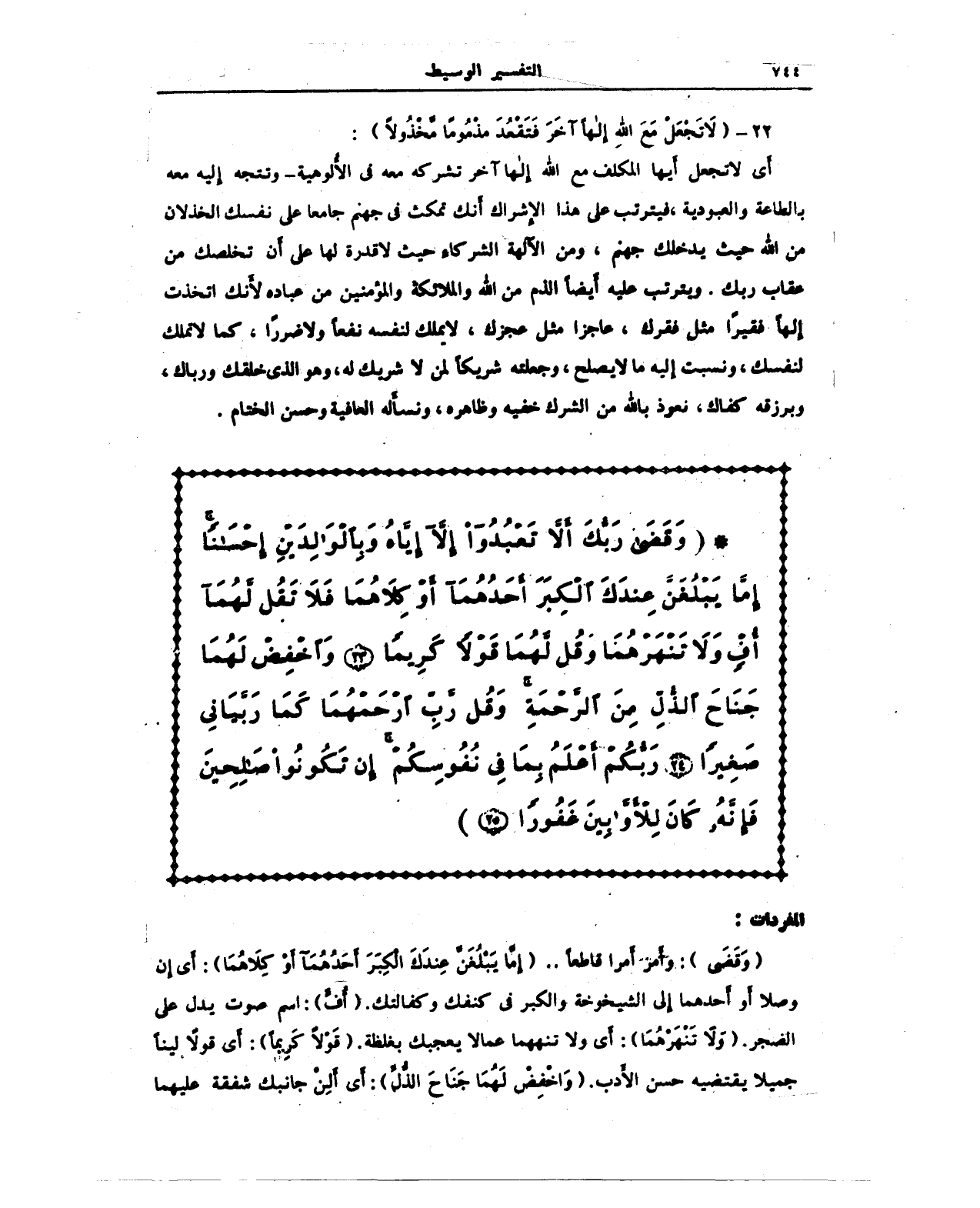 {وَقَضَى}: وأمر أمرا قاطعًا .. {إِمَّا يَبْلُغَنَّ عِنْدَكَ الْكِبَرَ أَحَدُهُمَا أَوْ كِلَاهُمَا}: أي إن وصلا أو أحدهما إلى الشيخوخة والكبر في كنفك وكفالتك. {أُفٍّ}: اسم صوت يدل على الضجر. {وَلَا تَنْهَرْهُمَا}: أي ولا تنههما عمالا يعجبك بغلظة. {قَوْلًا كَرِيمًا}: أي قولًا لينا جميلا يقتضيه حسن الأدب. {وَاخْفِضْ لَهُمَا جَنَاحَ الذُّلِّ}: أي ألِنْ جانبك شفقة عليهما