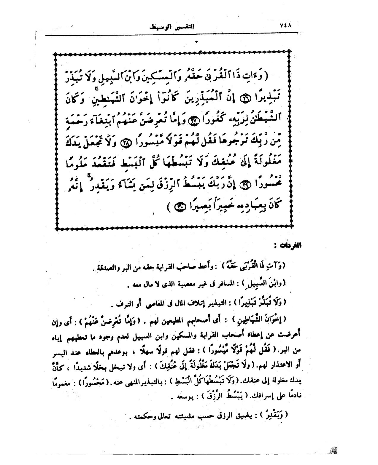 {وَآتِ ذَا الْقُرْبَى حَقَّهُ وَالْمِسْكِينَ وَابْنَ السَّبِيلِ وَلَا تُبَذِّرْ تَبْذِيرًا (26) إِنَّ الْمُبَذِّرِينَ كَانُوا إِخْوَانَ الشَّيَاطِينِ وَكَانَ الشَّيْطَانُ لِرَبِّهِ كَفُورًا (27) وَإِمَّا تُعْرِضَنَّ عَنْهُمُ ابْتِغَاءَ رَحْمَةٍ مِنْ رَبِّكَ تَرْجُوهَا فَقُلْ لَهُمْ قَوْلًا مَيْسُورًا (28) وَلَا تَجْعَلْ يَدَكَ مَغْلُولَةً إِلَى عُنُقِكَ وَلَا تَبْسُطْهَا كُلَّ الْبَسْطِ فَتَقْعُدَ مَلُومًا مَحْسُورًا (29) إِنَّ رَبَّكَ يَبْسُطُ الرِّزْقَ لِمَنْ يَشَاءُ وَيَقْدِرُ إِنَّهُ كَانَ بِعِبَادِهِ خَبِيرًا بَصِيرًا (30)}