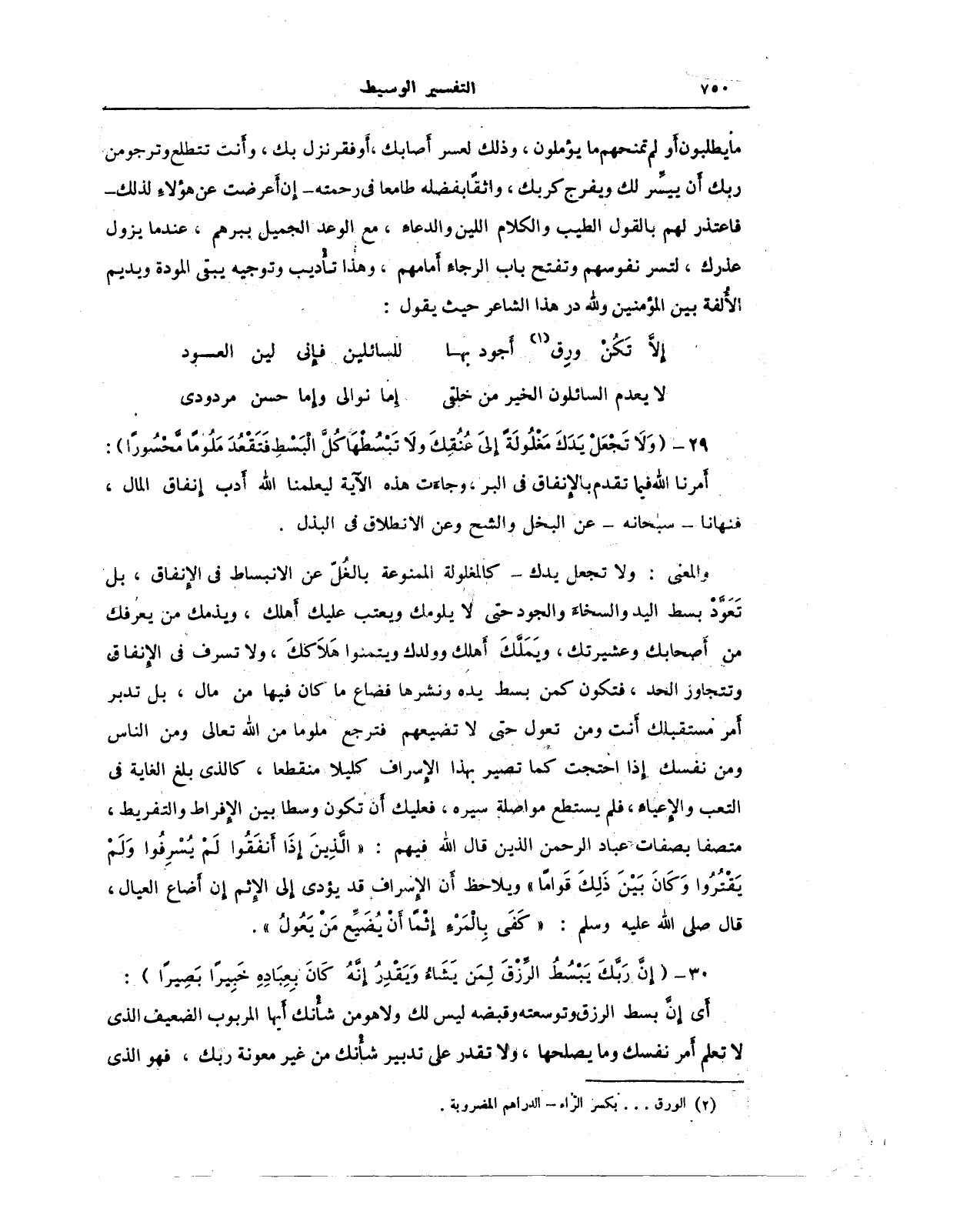 والمعنى: ولا تجعل يدك - كالمغلولة الممنوعة بالغُلّ عن الانبساط في الإنفاق، بل تَعوَّدْ بسط اليد والسخاء والجود حتى لا يلومك ويعتب عليك أَهلك، ويذمك من يعرفك من أصابك وعشيرتك، ويمَلكَ اهلك وولدك ويتمنوا هَلاَككَ، ولا تسرف في الإنفاق وتتجاوز الحد، فتكون كمن بسط يده ونشرها فضاع ما كان فيها من مال، بل تدبر أَمر مستقبلك أنت ومن تعول حتى لا تضيعهم فترجع ملوما من الله تعالى ومن الناس ومن نفسك إذا احتجت كما تصير بهذا الإسراف كليلا منقطعا، كالذى بلغ الغاية في التعب والإعياء، فلم يستطع مواصلة سيره، فعليك أَن تكون وسطا بين الإفراط والتفريط، متصفا بصفات عباد الرحمن الذين قال الله فيهم: {الَّذِينَ إِذَا أَنْفَقُوا لَمْ يُسْرِفُوا وَلَمْ يَقْتُرُوا وَكَانَ بَيْنَ ذَلِكَ قَوَامًا} ويلاحظ أن الإسراف قد يؤدى إِلى الإثم إن أَضاع العيال، قال - صلى الله عليه وسلم -: "كَفَى بِالْمَرء إثمًا أَنْ يُضَيِّع منْ يَعُول".