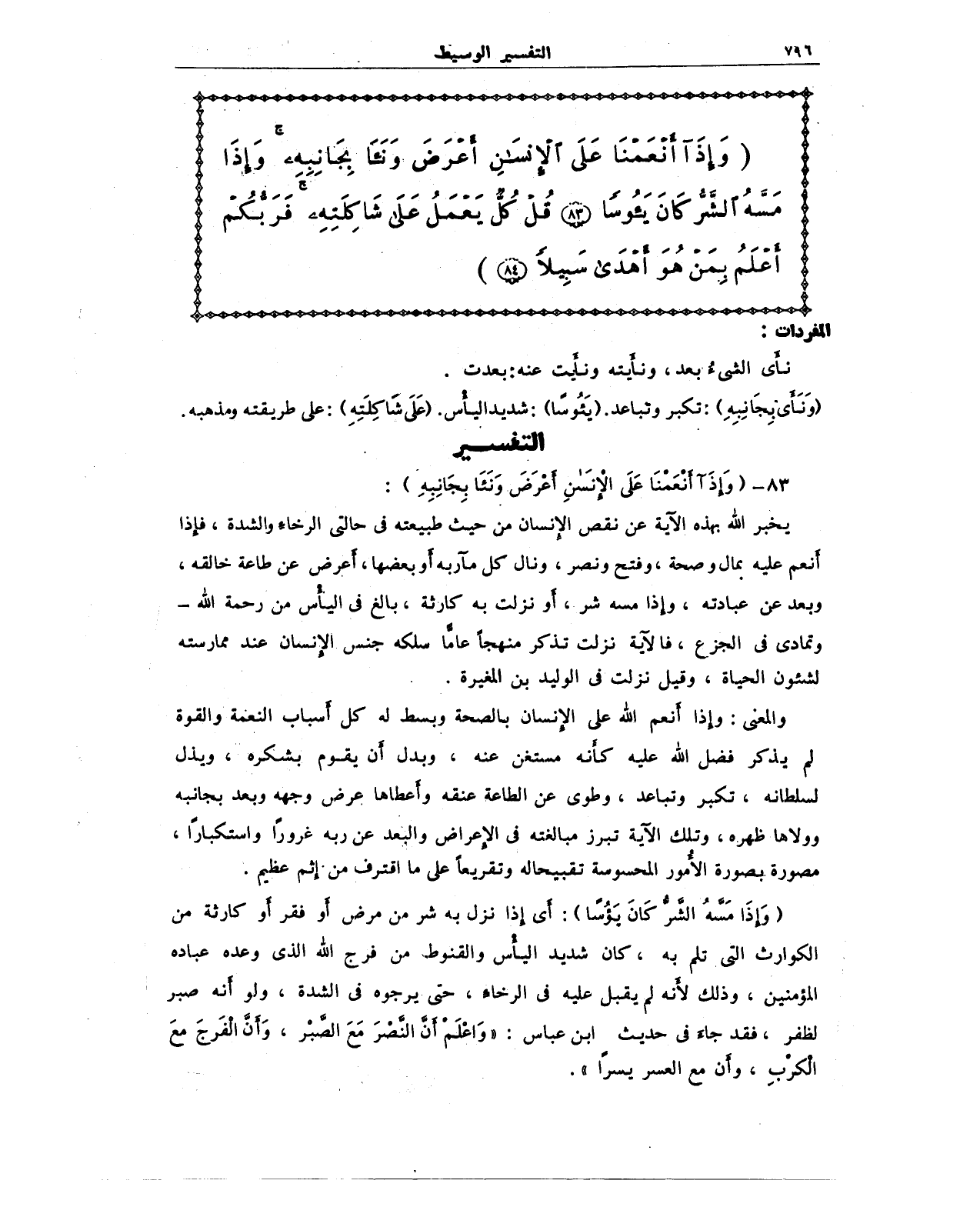 {وَإِذَا أَنْعَمْنَا عَلَى الْإِنْسَانِ أَعْرَضَ وَنَأَى بِجَانِبِهِ وَإِذَا مَسَّهُ الشَّرُّ كَانَ يَئُوسًا (83) قُلْ كُلٌّ يَعْمَلُ عَلَى شَاكِلَتِهِ فَرَبُّكُمْ أَعْلَمُ بِمَنْ هُوَ أَهْدَى سَبِيلًا (84)}