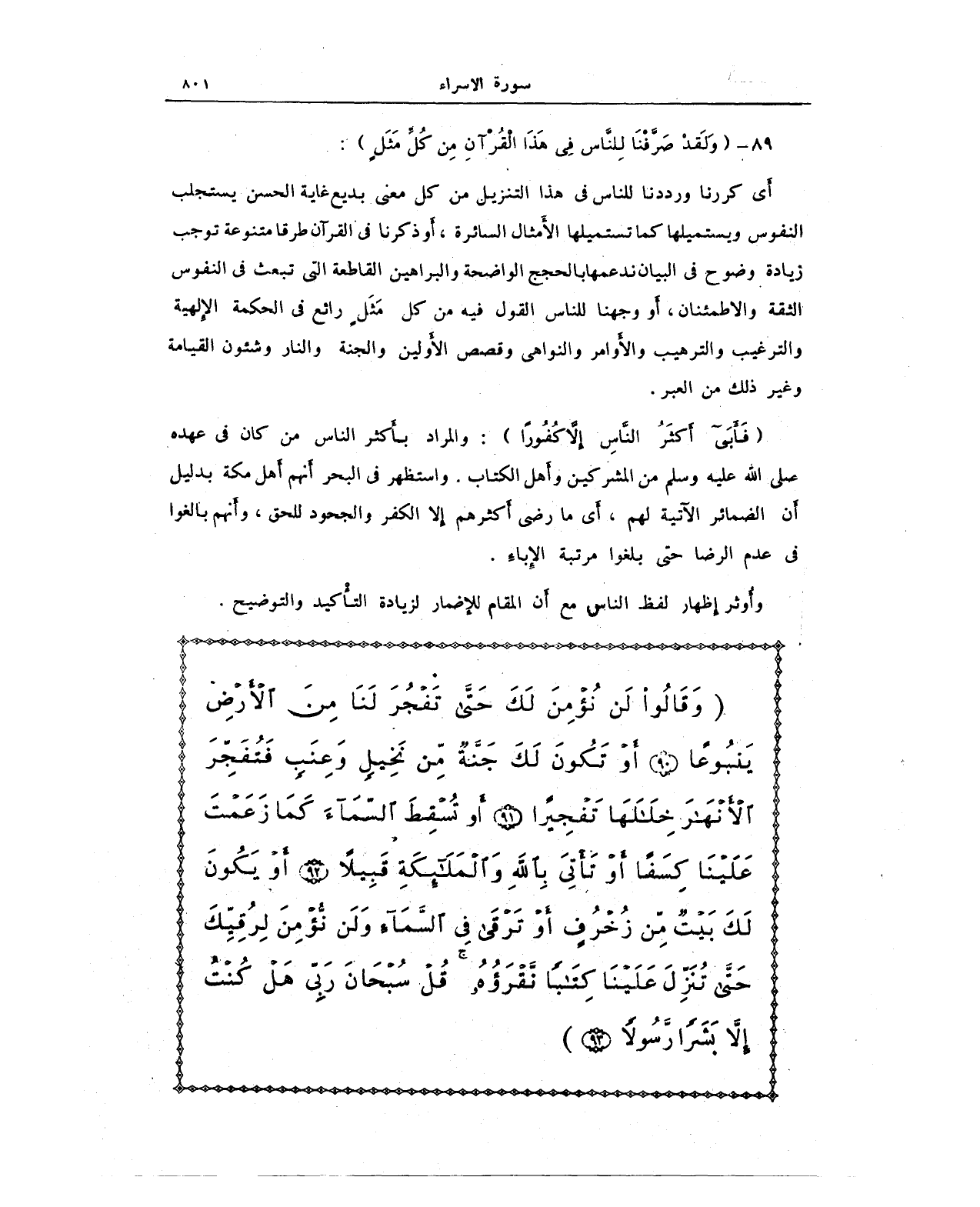 {وَقَالُوا لَنْ نُؤْمِنَ لَكَ حَتَّى تَفْجُرَ لَنَا مِنَ الْأَرْضِ يَنْبُوعًا (90) أَوْ تَكُونَ لَكَ جَنَّةٌ مِنْ نَخِيلٍ وَعِنَبٍ فَتُفَجِّرَ الْأَنْهَارَ خِلَالَهَا تَفْجِيرًا (91) أَوْ تُسْقِطَ السَّمَاءَ كَمَا زَعَمْتَ عَلَيْنَا كِسَفًا أَوْ تَأْتِيَ بِاللَّهِ وَالْمَلَائِكَةِ قَبِيلًا (92) أَوْ يَكُونَ لَكَ بَيْتٌ مِنْ زُخْرُفٍ أَوْ تَرْقَى فِي السَّمَاءِ وَلَنْ نُؤْمِنَ لِرُقِيِّكَ حَتَّى تُنَزِّلَ عَلَيْنَا كِتَابًا نَقْرَؤُهُ قُلْ سُبْحَانَ رَبِّي هَلْ كُنْتُ إِلَّا بَشَرًا رَسُولًا (93)}