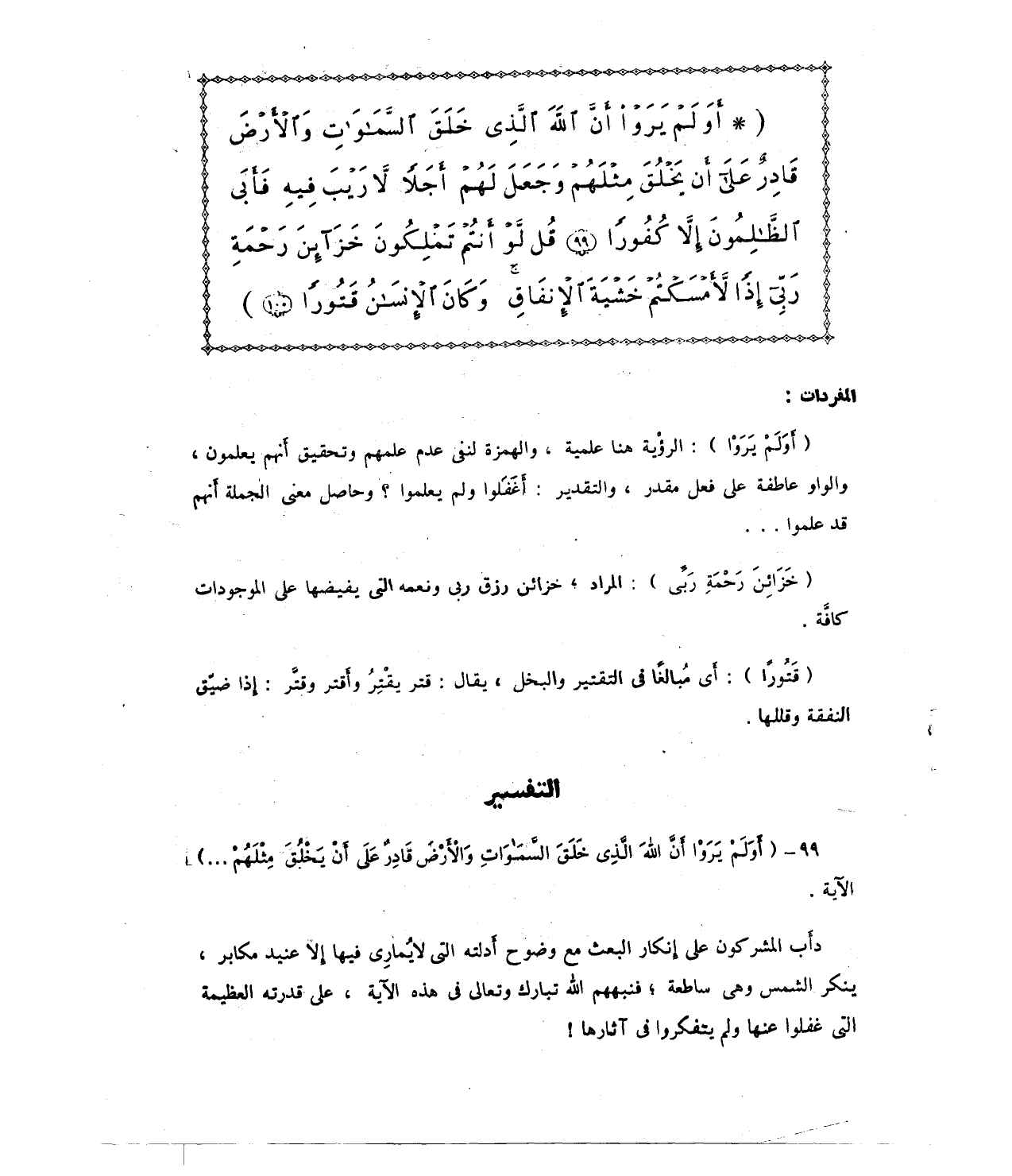 {أَوَلَمْ يَرَوْا أَنَّ اللَّهَ الَّذِي خَلَقَ السَّمَاوَاتِ وَالْأَرْضَ قَادِرٌ عَلَى أَنْ يَخْلُقَ مِثْلَهُمْ وَجَعَلَ لَهُمْ أَجَلًا لَا رَيْبَ فِيهِ فَأَبَى الظَّالِمُونَ إِلَّا كُفُورًا (99) قُلْ لَوْ أَنْتُمْ تَمْلِكُونَ خَزَائِنَ رَحْمَةِ رَبِّي إِذًا لَأَمْسَكْتُمْ خَشْيَةَ الْإِنْفَاقِ وَكَانَ الْإِنْسَانُ قَتُورًا (100)}