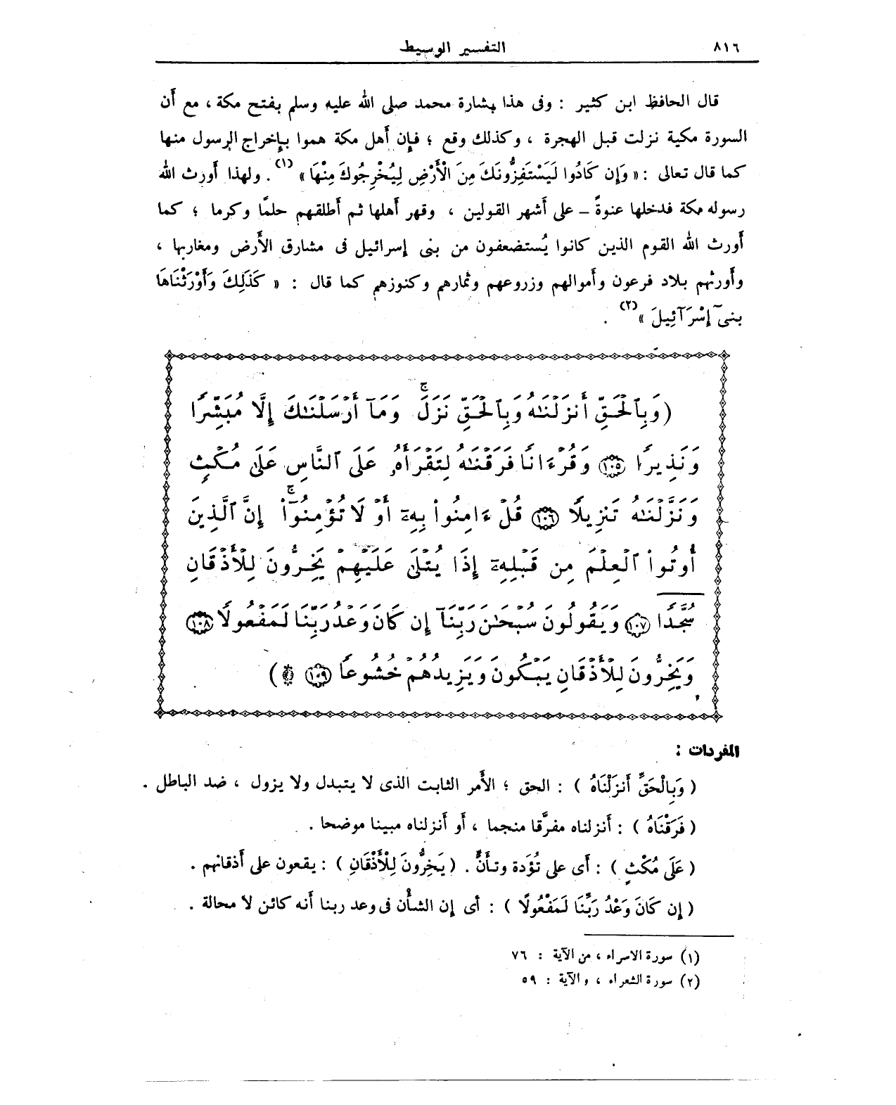 {وَبِالْحَقِّ أَنْزَلْنَاهُ وَبِالْحَقِّ نَزَلَ وَمَا أَرْسَلْنَاكَ إِلَّا مُبَشِّرًا وَنَذِيرًا (105) وَقُرْآنًا فَرَقْنَاهُ لِتَقْرَأَهُ عَلَى النَّاسِ عَلَى مُكْثٍ وَنَزَّلْنَاهُ تَنْزِيلًا (106) قُلْ آمِنُوا بِهِ أَوْ لَا تُؤْمِنُوا إِنَّ الَّذِينَ أُوتُوا الْعِلْمَ مِنْ قَبْلِهِ إِذَا يُتْلَى عَلَيْهِمْ يَخِرُّونَ لِلْأَذْقَانِ سُجَّدًا (107) وَيَقُولُونَ سُبْحَانَ رَبِّنَا إِنْ كَانَ وَعْدُ رَبِّنَا لَمَفْعُولًا (108) وَيَخِرُّونَ لِلْأَذْقَانِ يَبْكُونَ وَيَزِيدُهُمْ خُشُوعًا (109)}