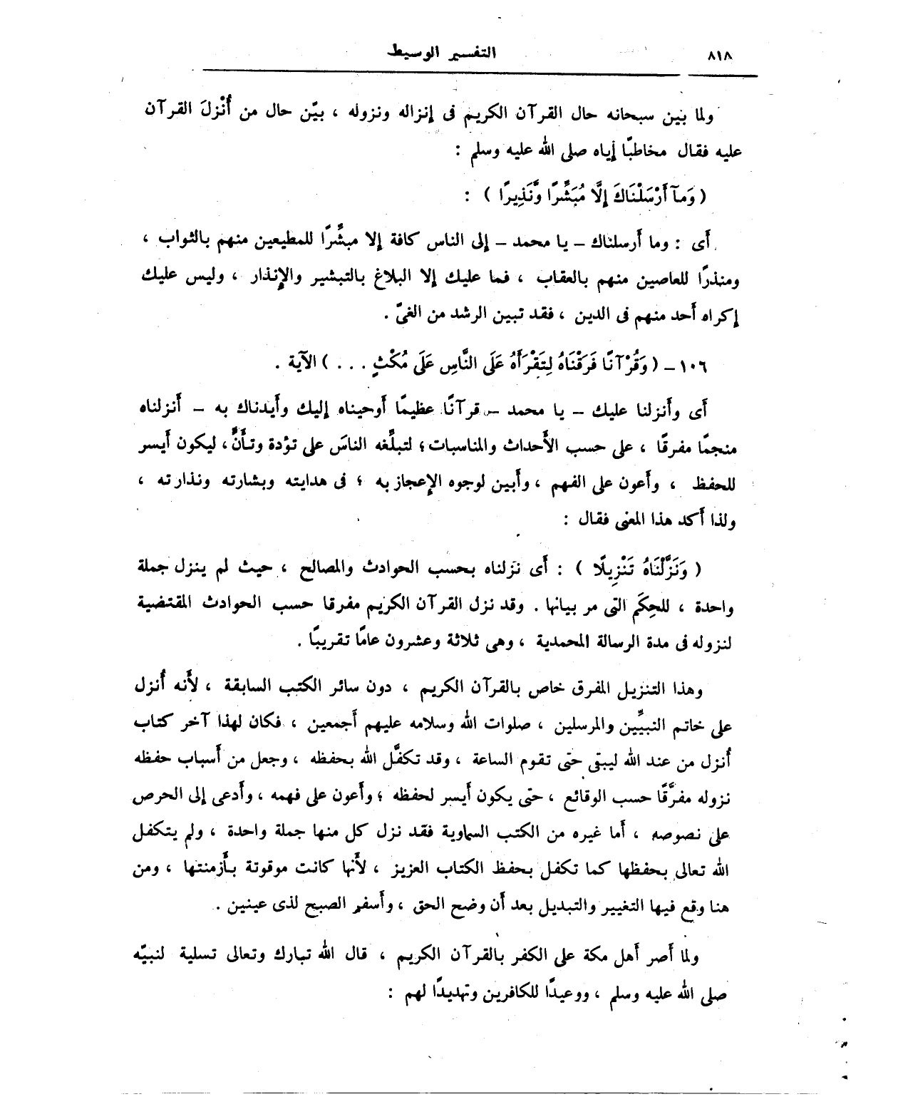 {وَنَزَّلْنَاهُ تَنْزِيلًا}: أَي نزلناه بحسب الحوادث والمصالح، حيث لم ينزل جملة واحدة، للحِكَم التي مر بيانها. وقد نزل القرآن الكريم مفرقا حسب الحوادث المقتضية لنزوله في مدة الرسالة المحمدية، وهي ثلاثة وعشرون عاما تقريبا.