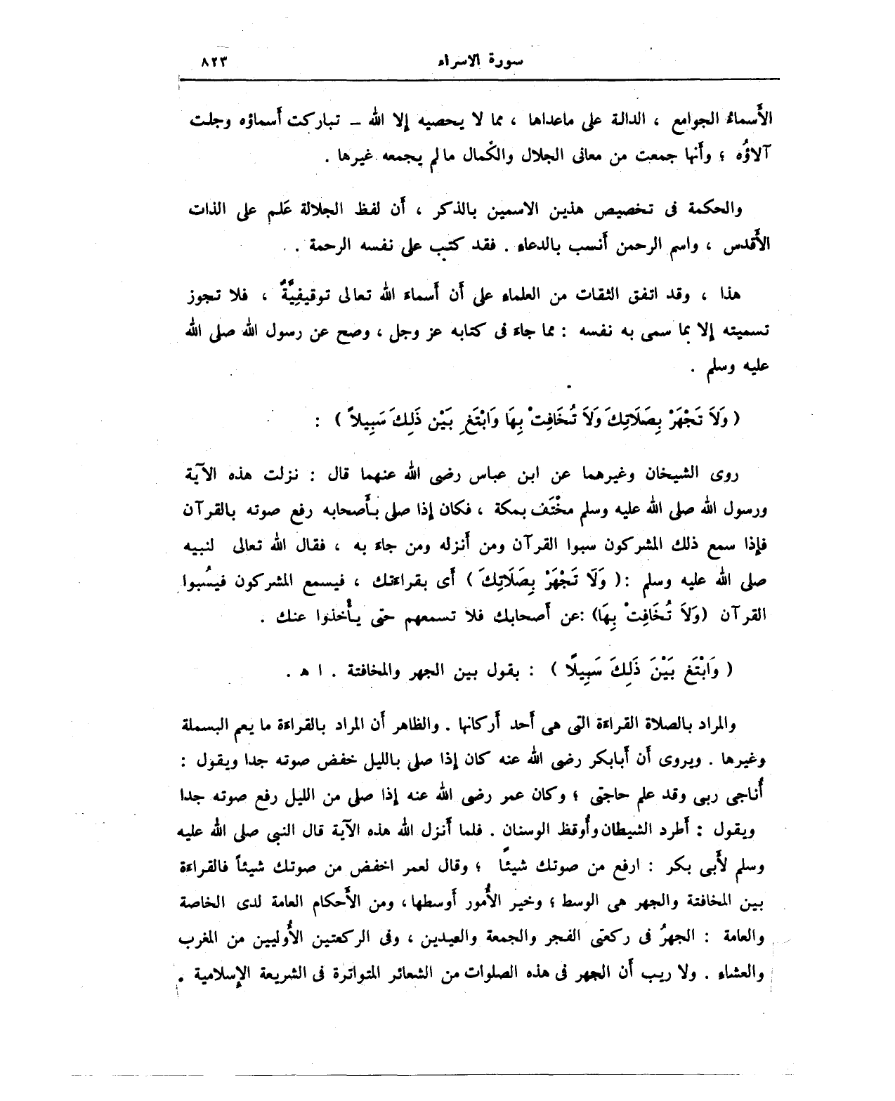 والمراد بالصلاة القراءة التي هي أَحد أركانها. والظاهر أَن المراد بالقراءة ما يعم البسملة وغيرها. ويروى أَن أَبا بكر رضي الله عنه كان إذا صلى بالليل خفض صوته جدا ويقول: أناجى ربي وقد علم حاجتى؛ وكان عمر رضي الله عنه إذا صلى من الليل رفع صوته جدًا ويقول: أَطرد الشيطان وأوقظ الوسنان. فلما أَنزل الله هذه الآية قال النبي صلى الله عليه وسلم لأبي بكر: ارفع من صوتك شيئًا، وقال لعمر أخفض من صوتك شيئًا فالقراءة بين المخافتة والجهر هي الوسط، وخير الأمور أَوسطها، ومن الأحكام العامة لدى الخاصة والعامة: الجهرُ في ركعتى الفجر والجمعة والعيدين، وفي الركعتين الأوليين من المغرب والعشاء. ولا ريب أَن الجهر في هذه الصلوات من الشعائر المتواترة في الشريعة الإِسلامية.
