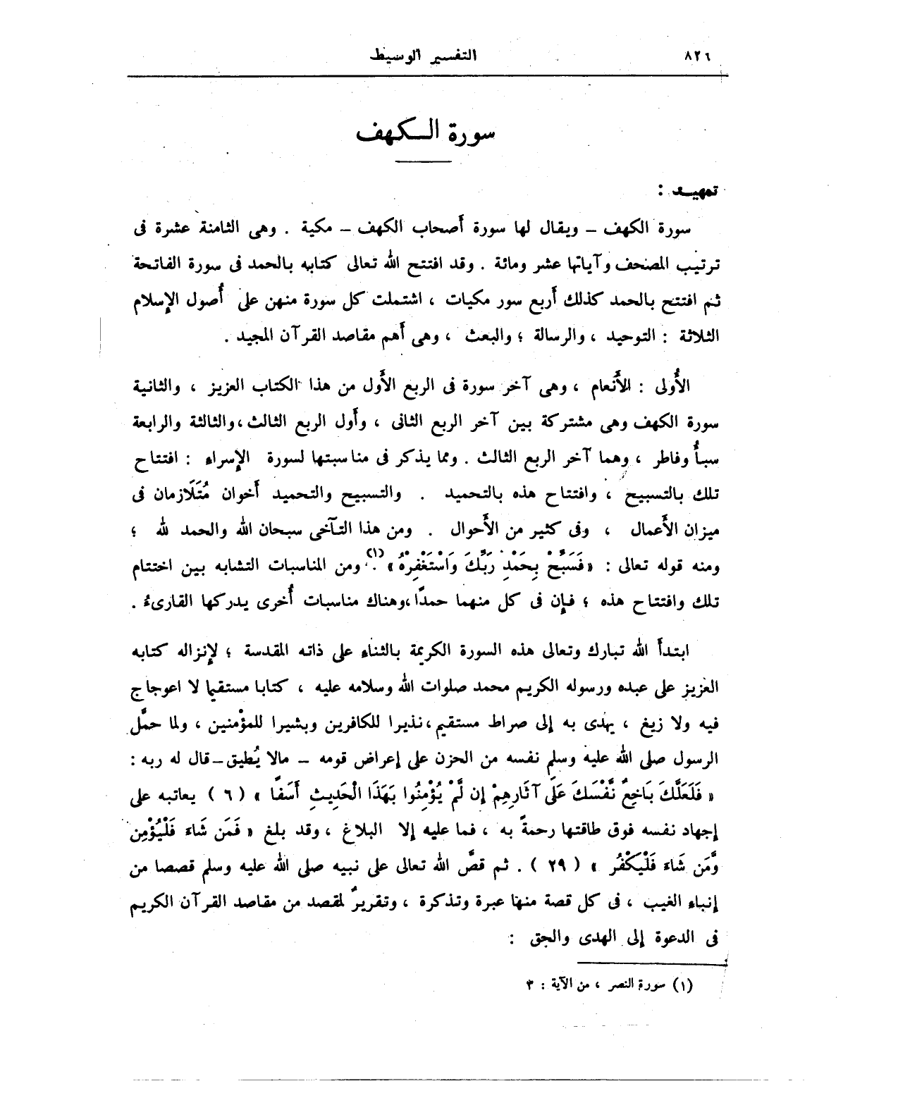 سورة الكهف - ويقال لها سورة أَصحاب الكهف - مكية. وهي الثامنة عشرة في ترتيب المصحف وآياتها عشر ومائة. وقد افتتح الله تعالى كتابه بالحمد في سورة الفاتحة ثم افتتح بالحمد كذلك أربع سور مكيات، اشتملت كل سورة منهن على أصول الإسلام الثلاثة: التوحيد، والرسالة؛ والبعث، وهي أهم مقاصد القرآن المجيد.