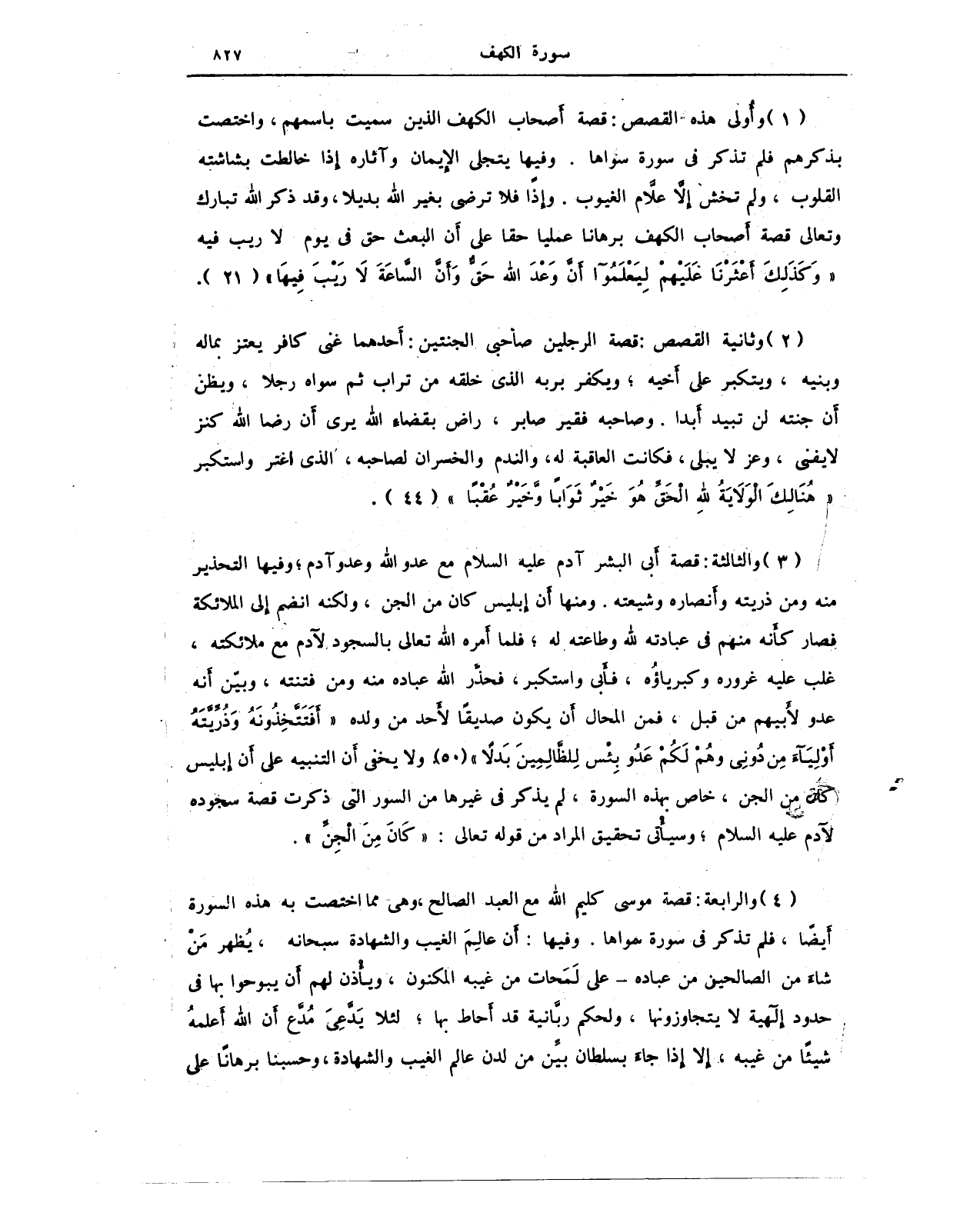 (3) والثالثة: قصة أبي البشر آدم عليه السلام مع عدو الله وعدو آدم، وفيها التحذير منه ومن ذريته وأنصاره وشيعته. ومنها أن إِبليس كان من الجن، ولكنه انضم إلى الملائكة فصار كأنه منهم في عبادته لله وطاعته له, فلما أَمره الله تعالى بالسجود لآدم مع ملائكته، غلب عليه غروره وكبرياؤُه، فأبى واستكبر، فحذر الله عباده منه ومن فتنته، وبيّن أنه عدو لأبيهم من قبل، فمن المحال إن يكون صديقًا لأحد من ولده {أَفَتَتَّخِذُونَهُ وَذُرِّيَّتَهُ أَوْلِيَاءَ مِنْ دُونِي وَهُمْ لَكُمْ عَدُوٌّ بِئْسَ لِلظَّالِمِينَ بَدَلًا} (50) ولا يخفى أن التنبيه على أن إبليس كان من الجن، خاص بهذه السورة، لم يذكر في غيرها من السور التي ذكرت قصة سجوده لآدم عليه السلام، وسيأتي تحقيق المراد من قوله تعالى: {كَانَ مِنَ الْجِنِّ}.