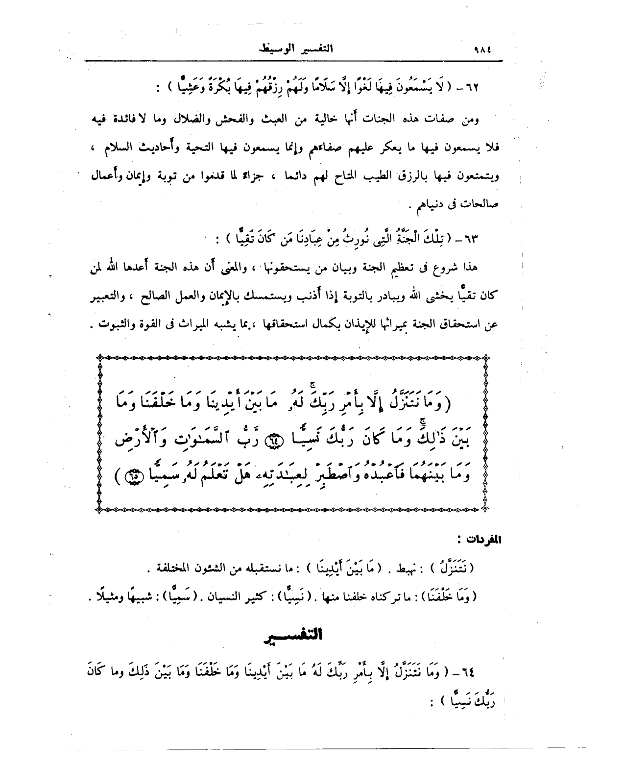 64 - {وَمَا نَتَنَزَّلُ إِلَّا بِأَمْرِ رَبِّكَ لَهُ مَا بَيْنَ أَيْدِينَا وَمَا خَلْفَنَا وَمَا بَيْنَ ذَلِكَ وَمَا كَانَ رَبُّكَ نَسِيًّا}:
