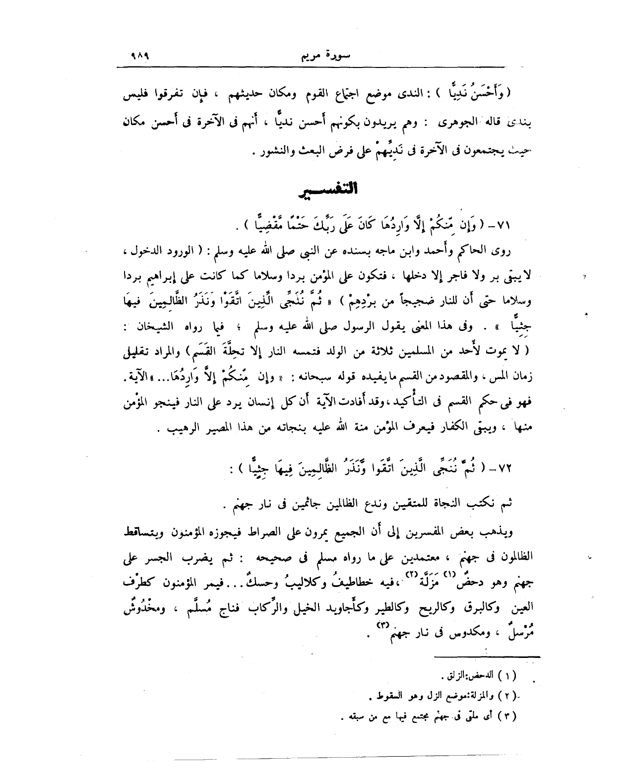 روى الحاكم وأحمد وابن ماجه بسنده عن النبي - صلى الله عليه وسلم -: (الورود الدخول، لا يبقى بر ولا فاجر إلا دخلها، فتكون على المؤمن بردًا وسلامًا كما كانت على إبراهيم بردا وسلاما حتى أَن للنار ضجيجًا من برْدِهِمْ) {ثُمَّ نُنَجِّي الَّذِينَ اتَّقَوْا وَنَذَرُ الظَّالِمِينَ فِيهَا جِثِيًّا}. وفي هذا المعنى يقول الرسول - صلى الله عليه وسلم -؛ فيما رواه الشيخان: (لا يموت لأحد من المسلمين ثلاثة من الولد فتمسه النار إلا تحِلَّةَ القَسَم) والمراد تقليل زمان المس، والمقصود من القسم ما يفيده قوله سبحانه: {وَإِنْ مِنْكُمْ إِلَّا وَارِدُهَا ... } الآية. فهو في حكم القسم في التأْكيد، وقد أفادت الآية أن كل إنسان يرد على النار فينجو المؤْمن منها، ويبقى الكفار فيعرف المؤمن منة الله عليه بنجاته من هذا المصير الرهيب.
